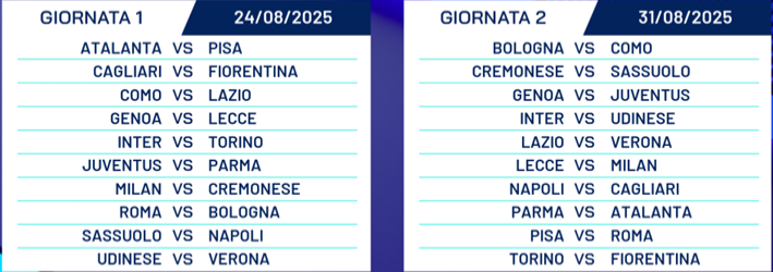 Un altro dettaglio fondamentale da tenere a mente è che la Serie A 2025/2026 inizierà il 23 agosto. Attivando MyPassClub in tempo, avrete la possibilità di vivere ogni match della vostra squadra senza perdere nemmeno un minuto, con un abbonamento pensato per chi vuole contenere i costi senza rinunciare all’esperienza completa. Questa combinazione tra prezzo contenuto e accesso esclusivo ai match rende l’offerta particolarmente vantaggiosa, soprattutto per gli appassionati che non vogliono farsi trovare impreparati all’inizio della stagione. A tal riguardo, negli incontri delle prime due settimane (sotto un'immagine delle partite) potrebbe esserci proprio la squadra che più vi interessa, motivo per cui prima valutate questa offerta e meglio sarà!