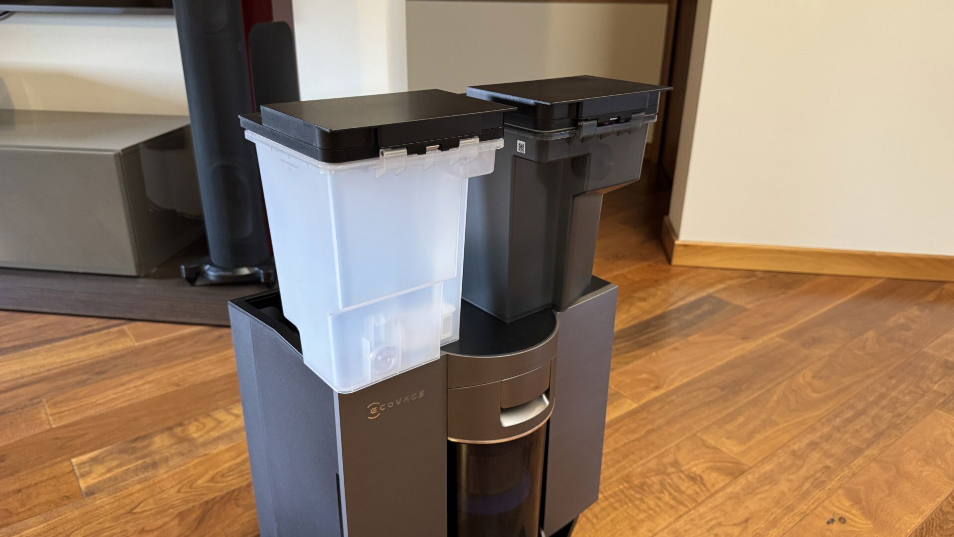 La base dispone anche di doppi serbatoi per acqua pulita (3,2 litri) e sporca (2,7 litri), e di un sistema a doppia vasca per detergenti, capace di alternare soluzioni normali e ad alta concentrazione per macchie difficili.