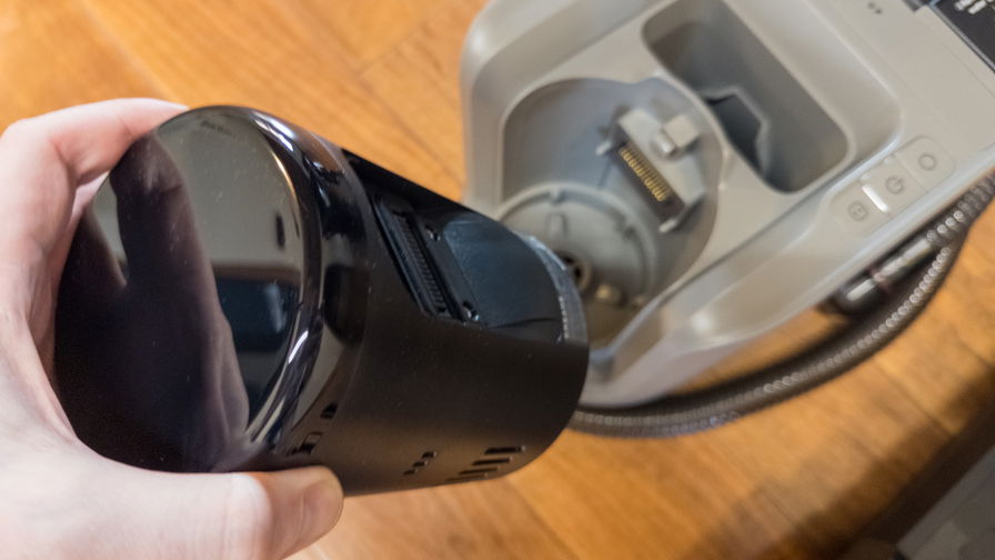 Come già detto, il motore e la batteria sono gli elementi condivisi da tutti e tre i moduli. La batteria è rimovibile (5.000 mAh) e può essere sfilata in un solo gesto; ciò significa che, in caso di degrado, non è necessario sostituire l’intero dispositivo. In modalità aspirazione “secca”, il kit promette fino a 75 minuti di autonomia; in modalità lavapavimenti, fino a 65 minuti.
