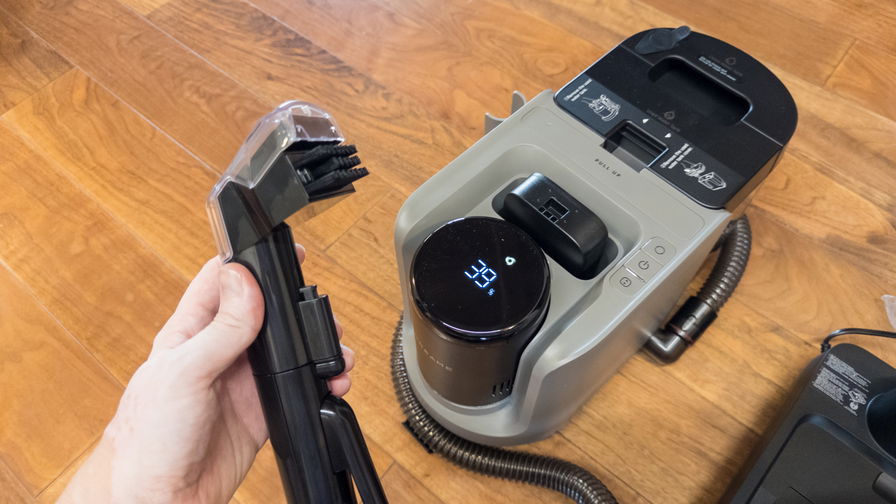 Il modulo lavatappeti è probabilmente quello meno diffuso ma, in alcuni casi, più apprezzato del kit. Questo modulo ha un serbatoio per acqua pulita, un tubo collegato al serbatoio dell’acqua sporca e una spazzola specifica per moquette e tappeti. La potenza di aspirazione dichiarata è di 19.000 Pa. È anche previsto un pulsante per attivare la diffusione dell’acqua (che può essere riscaldata fino a 60 °C) assieme al detergente, mentre la spazzola procede nella pulizia e il tubo aspira l’acqua sporca residua. Il tubo ha una lunghezza di circa 1,5 metri, che offre una certa libertà nei movimenti.