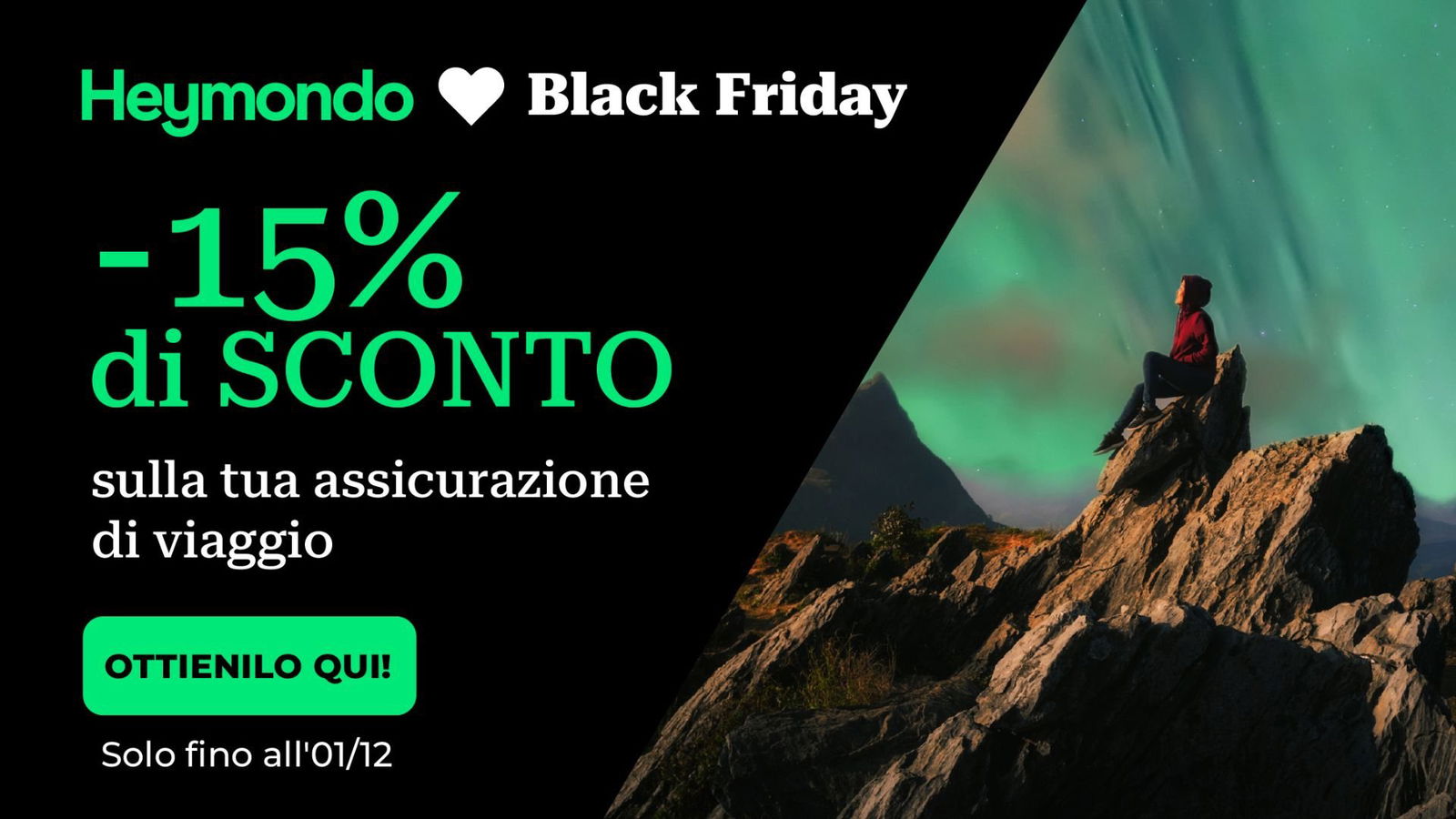 Fissare il vostro prossimo viaggio non è mai stato così conveniente. Con Heymondo, potete approfittare di uno sconto del 15% su tutte le polizze stipulate fino al 1° dicembre, senza limiti sulle date di viaggio. Lo sconto viene applicato automaticamente, permettendovi di proteggere la vostra esperienza senza alcun pensiero aggiuntivo. È il momento perfetto per pianificare la vostra avventura e partire con la certezza di essere coperti.