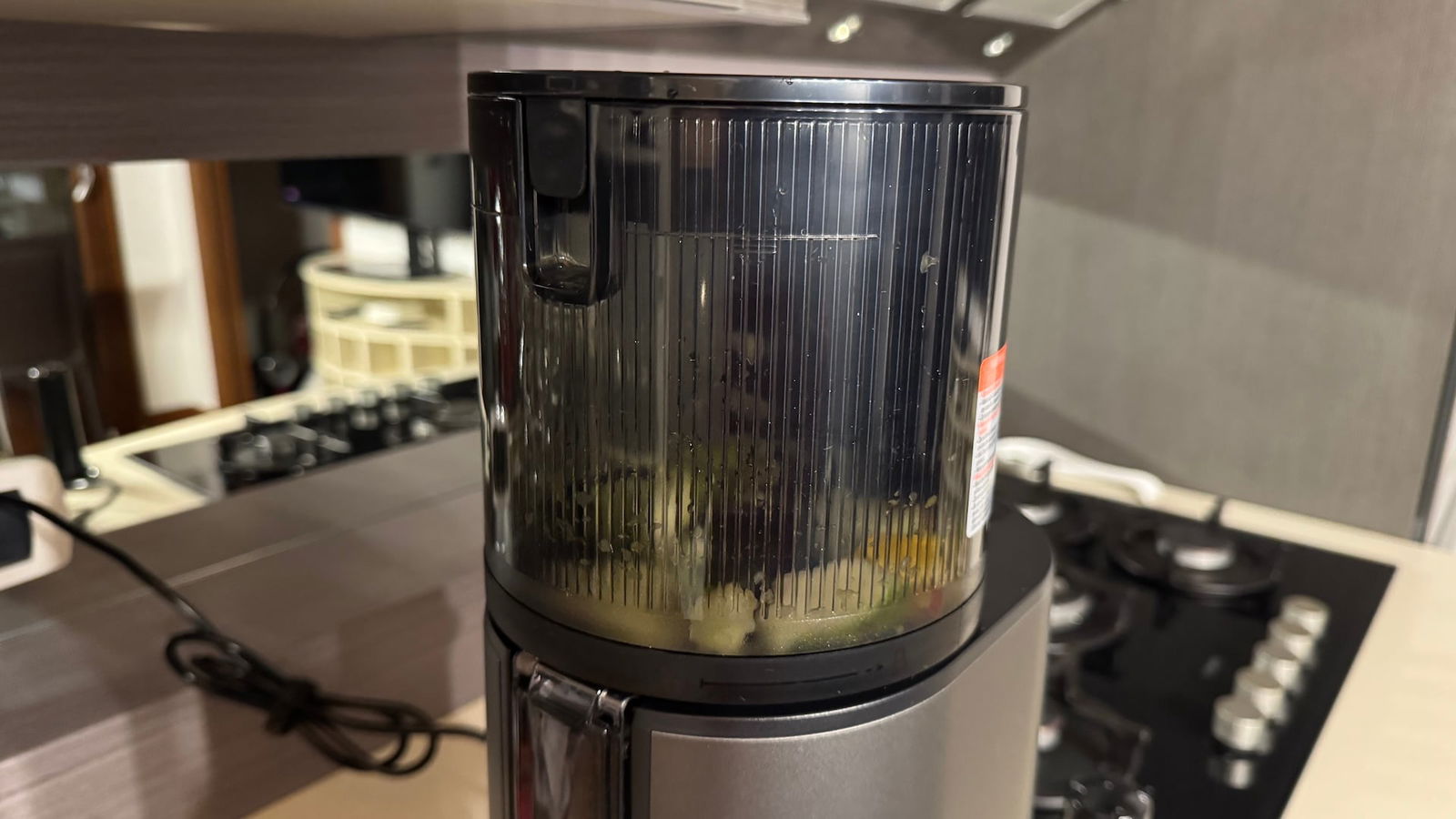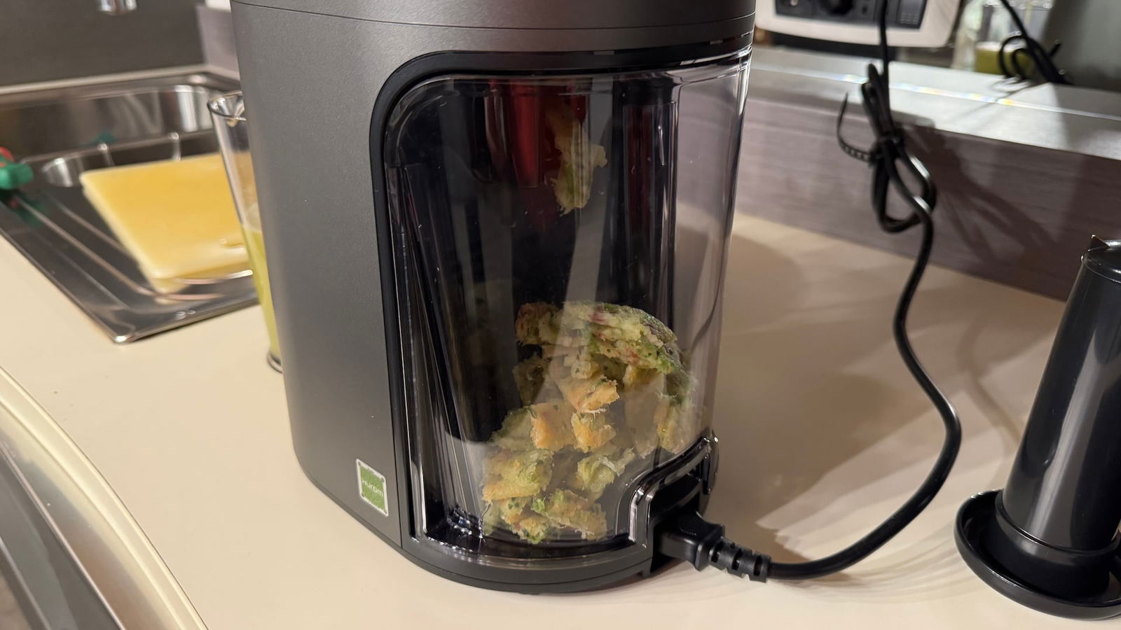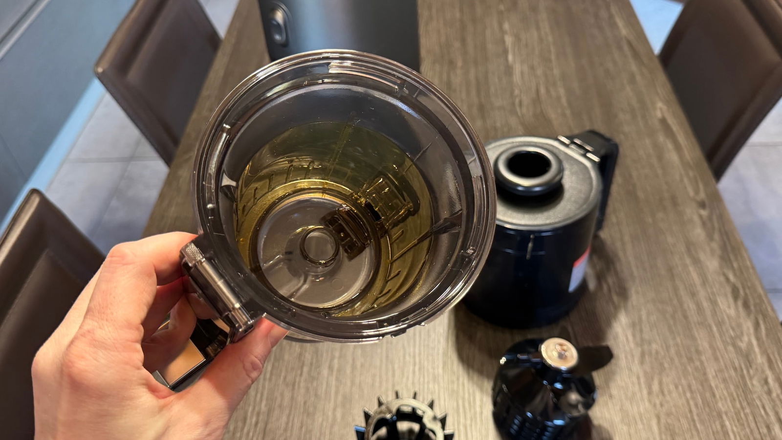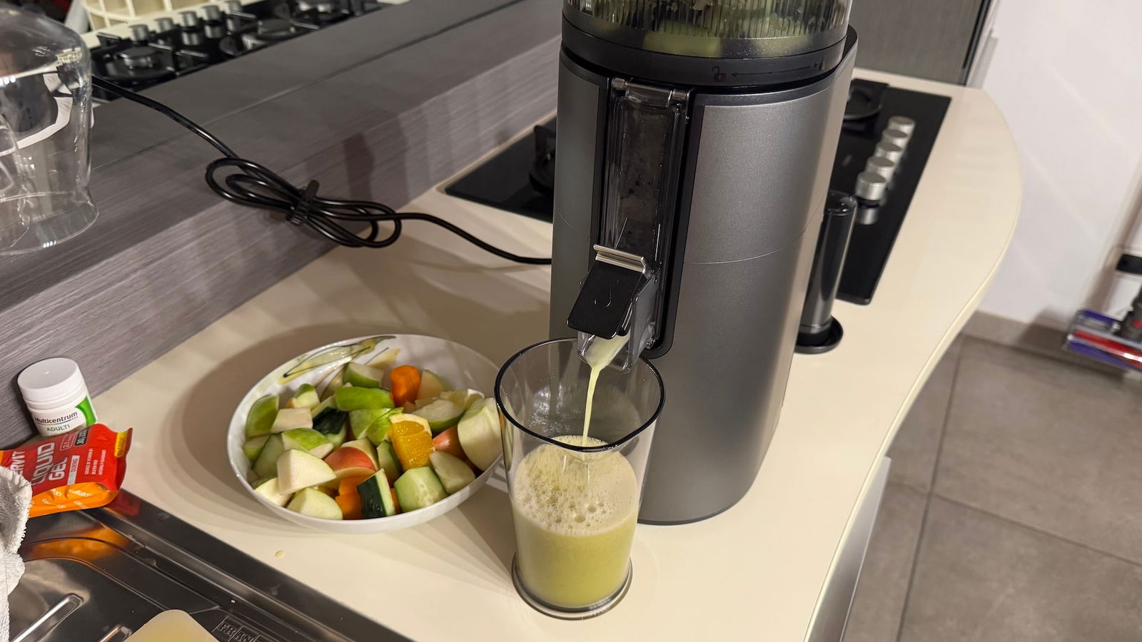 Provandolo con vari ingredienti, abbiamo notato che con verdure dure e dense quali carote, barbabietole, rape e sedano rapa, l'apparecchio estrae efficientemente il succo senza fatica apparente del motore, producendo un estratto limpido e corposo con una resa volumetrica elevata che tipicamente raggiunge il 65-75% del peso iniziale dell'ingrediente, e residui polposi relativamente secchi che indicano un'estrazione efficiente del contenuto liquido.