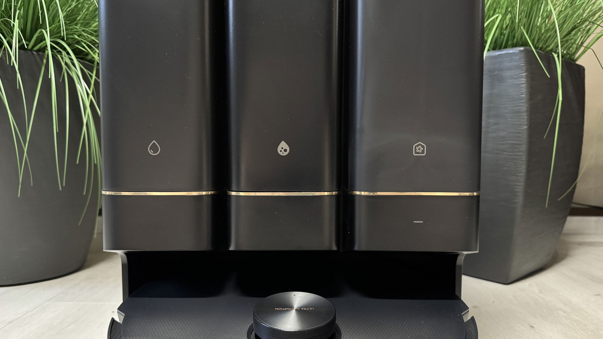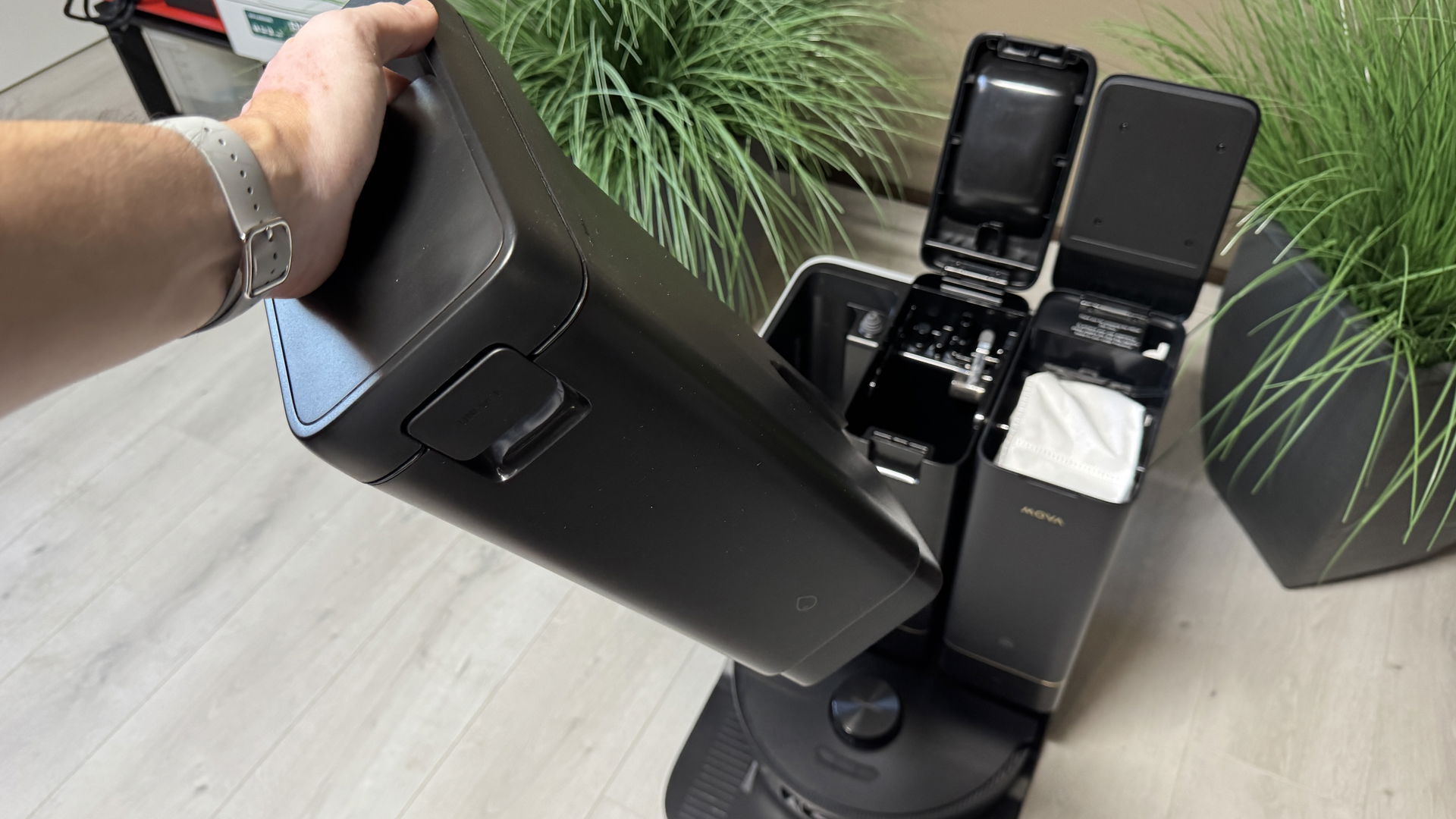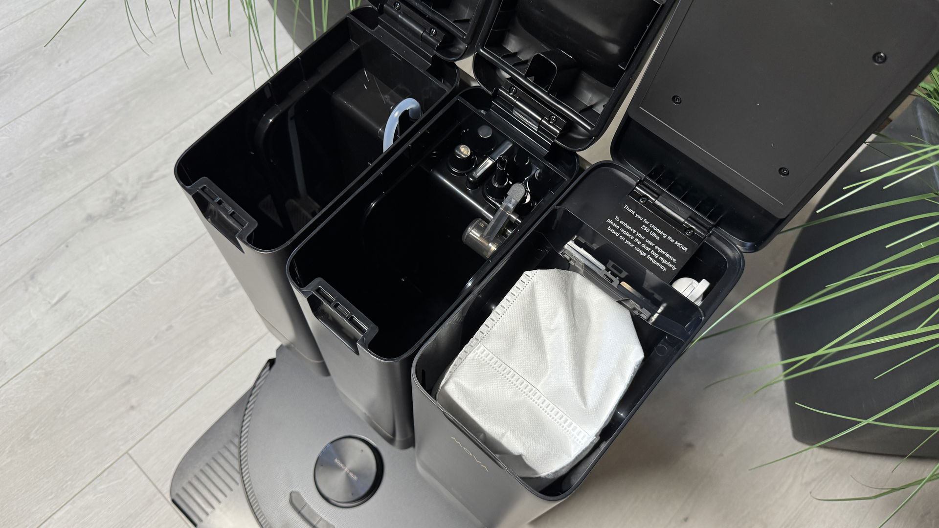 Il contenitore della polvere interno ha una capacità di 300ml, relativamente modesta ma compensata dalla funzione di auto-svuotamento nella base. Il serbatoio dell'acqua pulita integrato nel robot è sufficiente per sessioni di lavaggio continuative, grazie anche al rifornimento automatico dalla base.