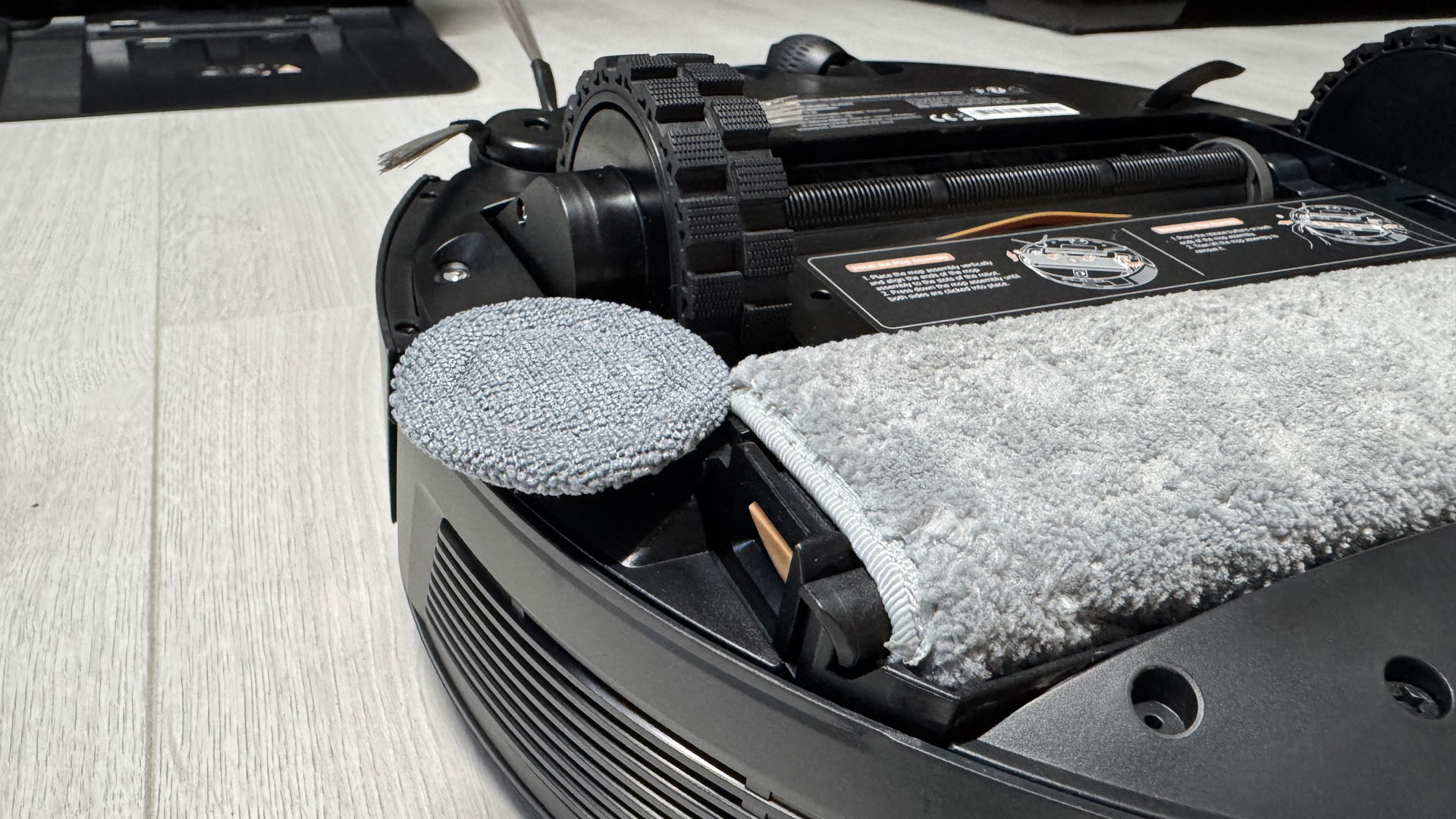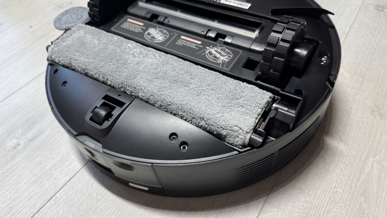 Nella parte inferiore troviamo una spazzola centrale anti-groviglio, progettata specificamente per raccogliere efficacemente peli e capelli senza che questi si attorciglino, affiancata da una spazzola laterale che convoglia lo sporco verso il centro. L'elemento distintivo è tuttavia il sistema di lavaggio HydroSync, composto da un rullo in microfibra che ruota a 180 giri al minuto, applicando una pressione di 18N sul pavimento. Questo rullo viene costantemente inumidito con acqua riscaldata a 36°C, temperatura che facilita la rimozione di macchie grasse e incrostazioni.