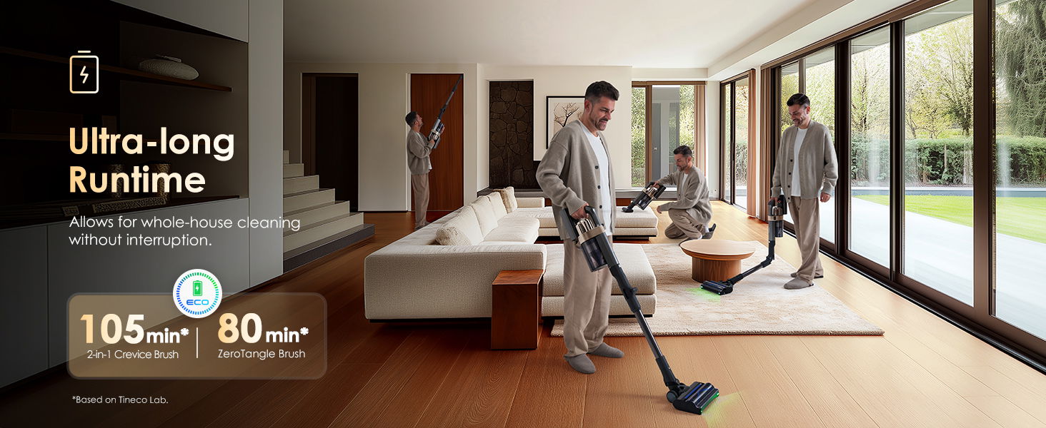 Le tecnologie smart di Tineco, come il 3DSense Power Brush, migliorano ulteriormente l'efficienza. Questo sistema integra i sensori DustSense, EdgeSense e LightSense. DustSense rileva la quantità di polvere e regola automaticamente la potenza di aspirazione, mentre EdgeSense aumenta la potenza vicino alle pareti per una pulizia impeccabile dei bordi. LightSense, con il suo faro a 120° ad ampio angolo, illumina la zona di pulizia e rivela anche le particelle di polvere più piccole.