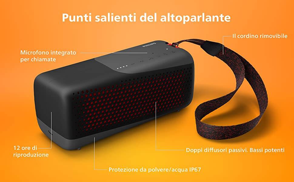 Anche se stiamo parlando di uno speaker che pesa solo 490g, godrete di un audio cristallino e bassi potenti, grazie ai doppi diffusori passivi, ma se volete alzare ancora il volume della festa potrete sempre accoppiare due altoparlanti, per un coinvolgente effetto stereo. Inoltre, il comodo cordino rimovibile vi permetterà di portarlo sempre con voi, ad esempio agganciandolo al vostro zaino o fissandolo comodamente alla vostra bici. Potrete stare tranquilli in ogni situazione, persino in spiaggia o sotto la pioggia, in quanto la certificazione IP67 rende questo ottimo modello resistente alla polvere e impermeabile all'acqua.