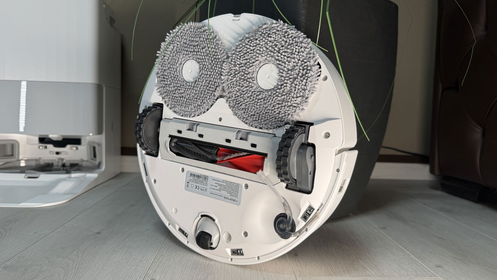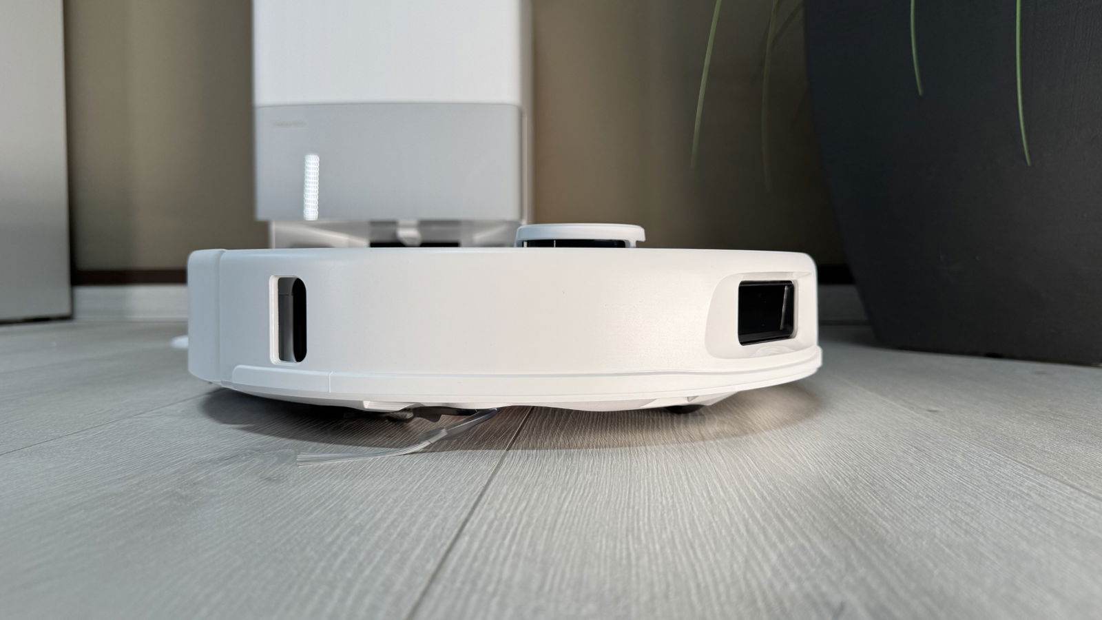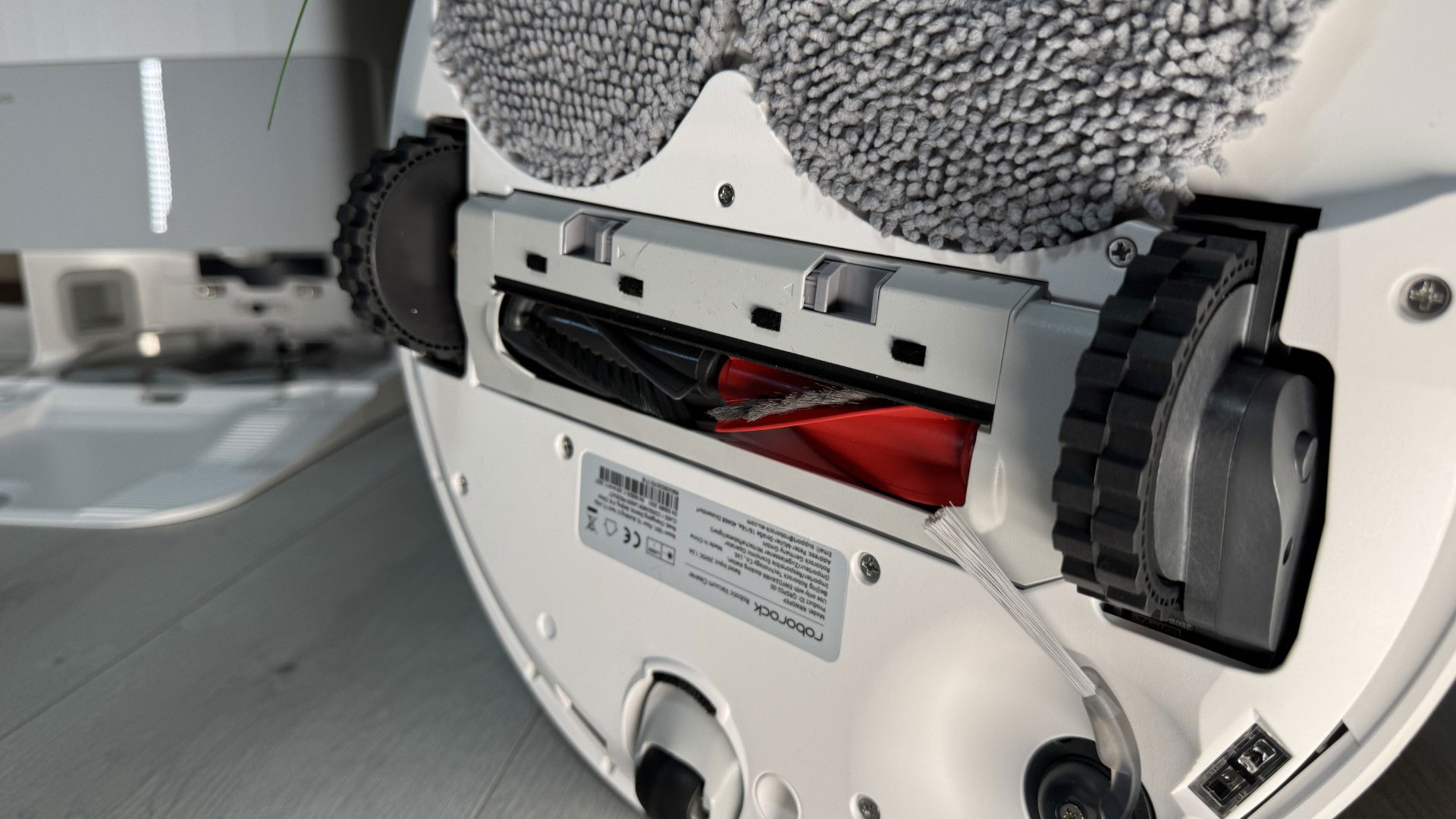Nella parte inferiore del robot troviamo il sistema di pulizia DuoDivide, una spazzola principale che combina setole in nylon e lame in gomma disposte secondo uno schema a V che previene efficacemente l'aggrovigliamento di peli e capelli, riducendo la necessità di manutenzione. Questo componente lavora in sinergia con la spazzola laterale FlexiArm, capace di estendersi fino a 10 mm per raggiungere efficacemente angoli e bordi.