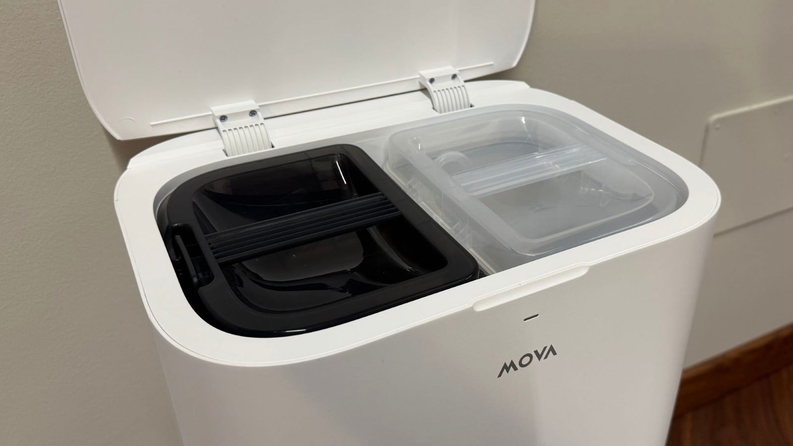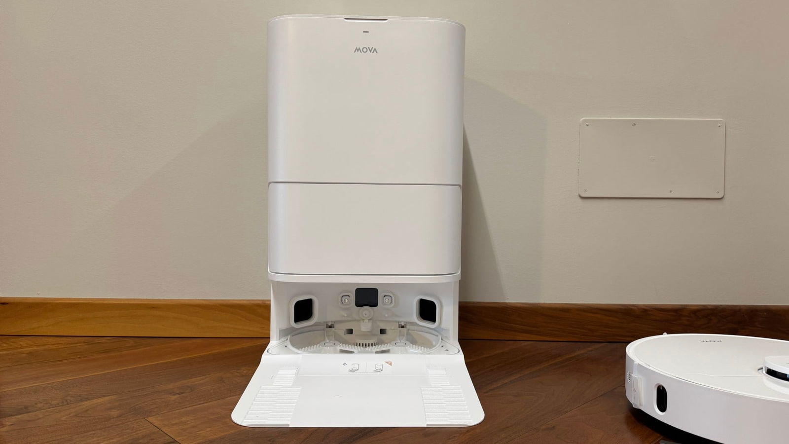 Il MOVA E40 Ultra ha dimensioni standard, con un corpo principale di 350 × 350 × 97 mm e un peso di 4 kg, ed è capace di superare ostacoli alti fino a 22 mm. La stazione di ricarica e svuotamento misura 340 × 457 × 590 mm, con sviluppo verticale per ridurre l’ingombro a pavimento. Al suo interno trova posto un sacchetto per la polvere da 3,2 litri, affiancato da due serbatoi: uno per l’acqua pulita da 4,5 litri e uno per l’acqua sporca da 4 litri. Questa configurazione permette di raggiungere l’autonomia dichiarata di 75 giorni.