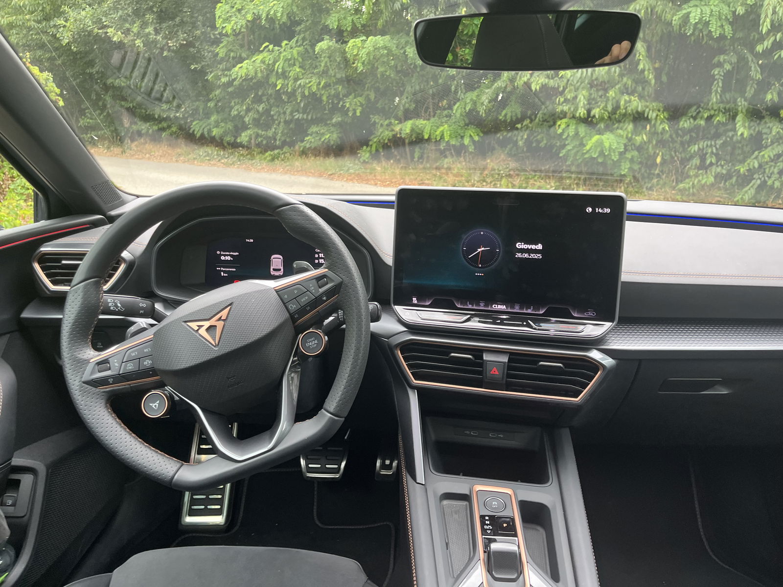 I sedili anteriori, con poggiatesta integrato e logo Cupra serigrafato, non sono solo belli da vedere ma anche straordinariamente comodi. La qualità percepita è alta, con materiali curati e uno stile coerente col posizionamento del marchio.