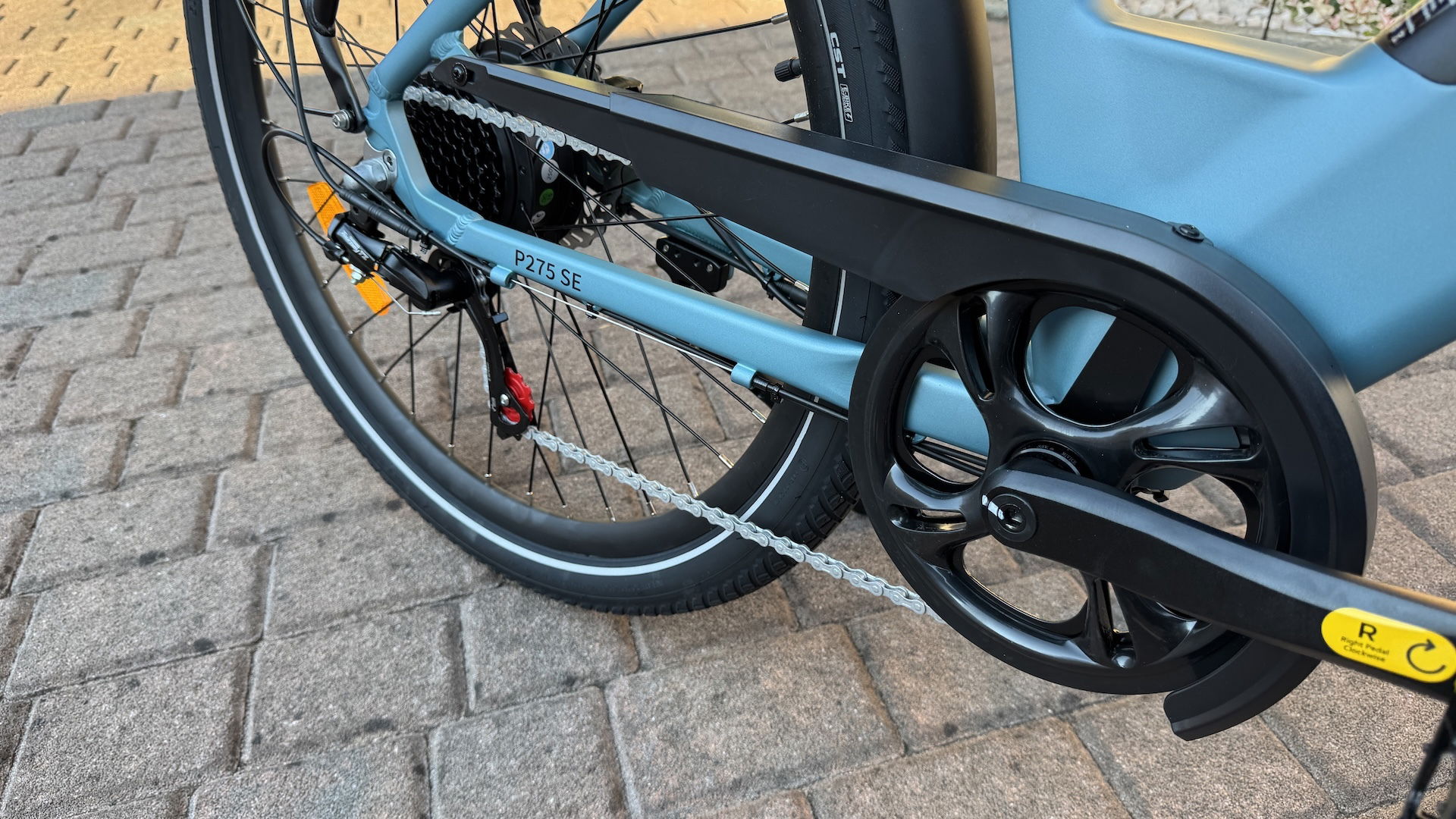 La dotazione di serie include parafanghi in metallo, un portapacchi anteriore con capacità di carico fino a 10 kg, luci LED integrate con funzionamento automatico e un display LCD posizionato al centro del manubrio. Quest'ultimo mostra informazioni essenziali come velocità, livello di carica della batteria, distanza percorsa e livello di assistenza selezionato. La P275 SE supporta anche la connessione con un'app dedicata tramite Bluetooth, che permette di monitorare parametri di guida più dettagliati, pianificare percorsi e effettuare diagnostica di base.