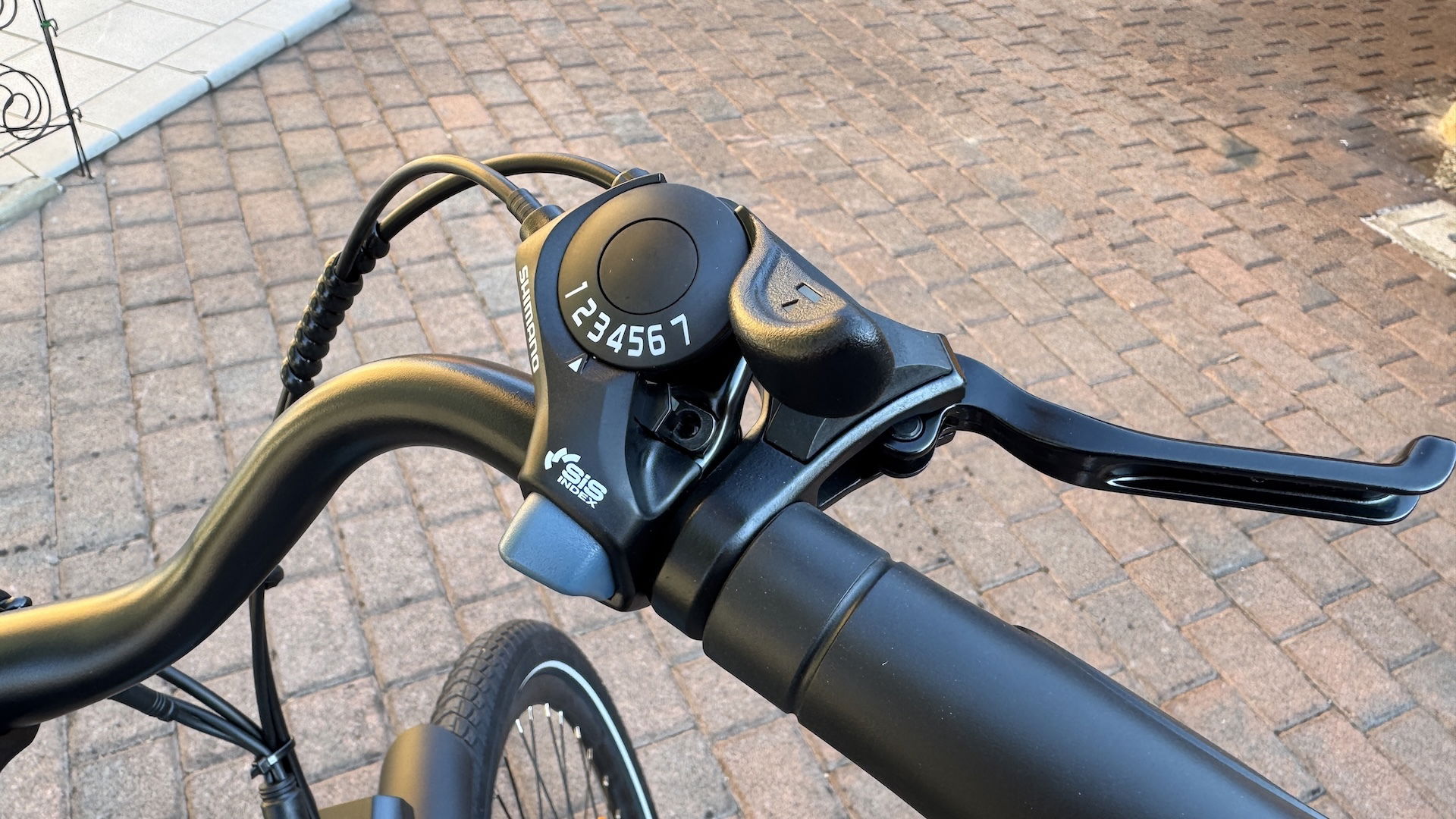 La trasmissione è affidata a un cambio Shimano a 7 velocità con deragliatore Tourney, una soluzione affidabile e diffusa che permette di affrontare percorsi con moderate variazioni altimetriche. La catena è protetta da un carter che ne previene il contatto con indumenti e riduce la necessità di manutenzione. I freni a disco idraulici Tektro con rotori da 160mm all'anteriore e al posteriore offrono una potenza frenante adeguata e modulabile, con il vantaggio di richiedere minor forza di azionamento rispetto ai sistemi meccanici.