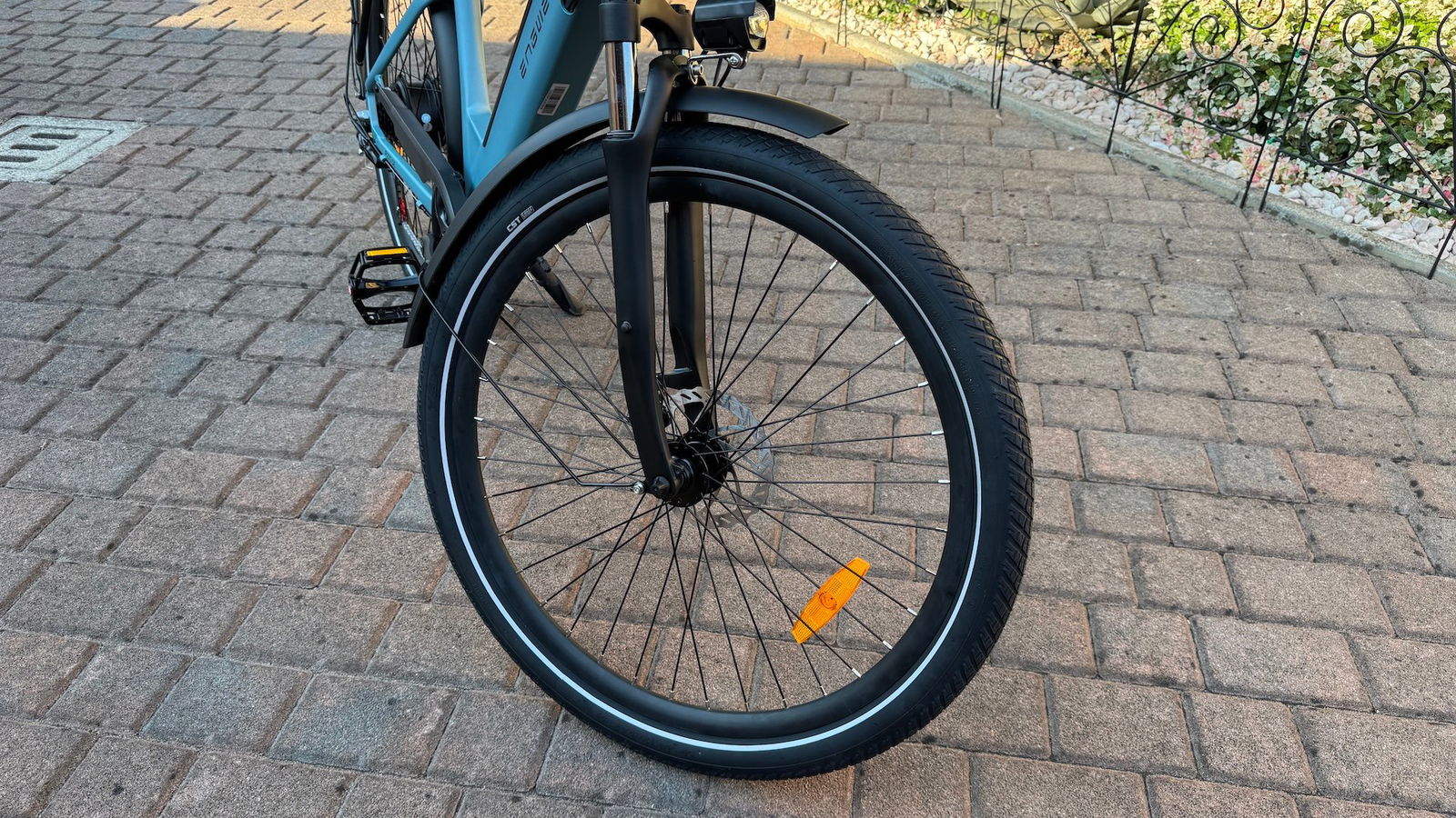 Gli pneumatici da 27,5 pollici con sezione di 1,95" rappresentano un compromesso tra scorrevolezza e comfort, con un battistrada semi-slick adatto principalmente all'uso su asfalto ma in grado di affrontare anche brevi tratti sterrati. La mancanza di sospensioni, sia anteriori che posteriori, è compensata solo parzialmente dal volume degli pneumatici, che possono essere utilizzati a pressioni relativamente basse (30-35 PSI) per assorbire parte delle vibrazioni.