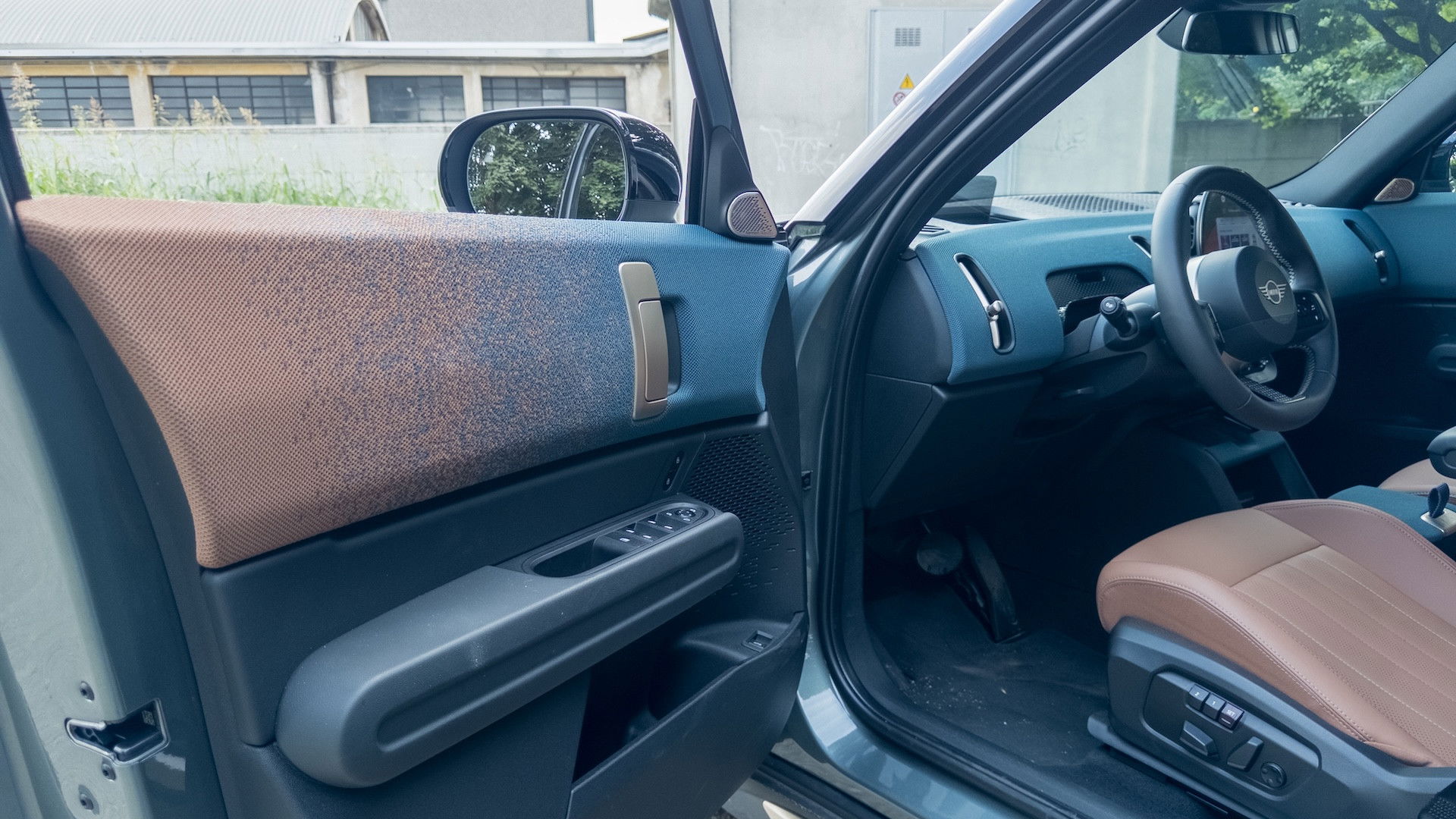 Mini ha usato in mix di materiali tecnici (riciclati) e plastiche. Il risultato è molto bello da vedere, a patto che lo stile vi piaccia. Il tessuto, o una sorta di, ricopre tutta la plancia e gli inserti nelle portiere. Il mix di colori che sfuma dal verde al marrone, per poi abbinarsi al colore dei sedili, funziona. Insomma, si percepisce qualità pressoché ovunque. Anche la “cinghia” decorativa che funge da terza razza si integra bene nell’ambiente. Ci sono vari vani per gli oggetti, molto funzionali.