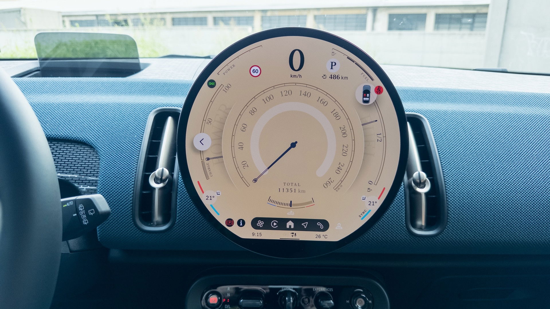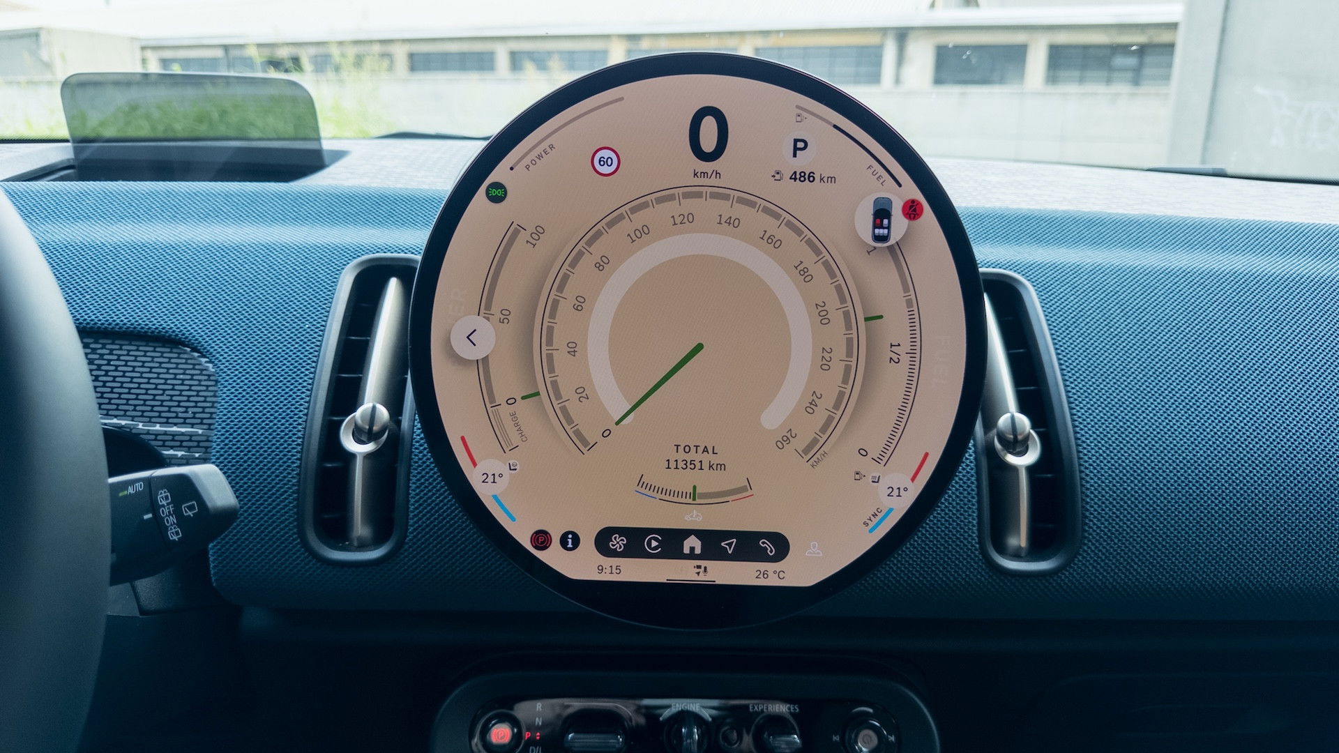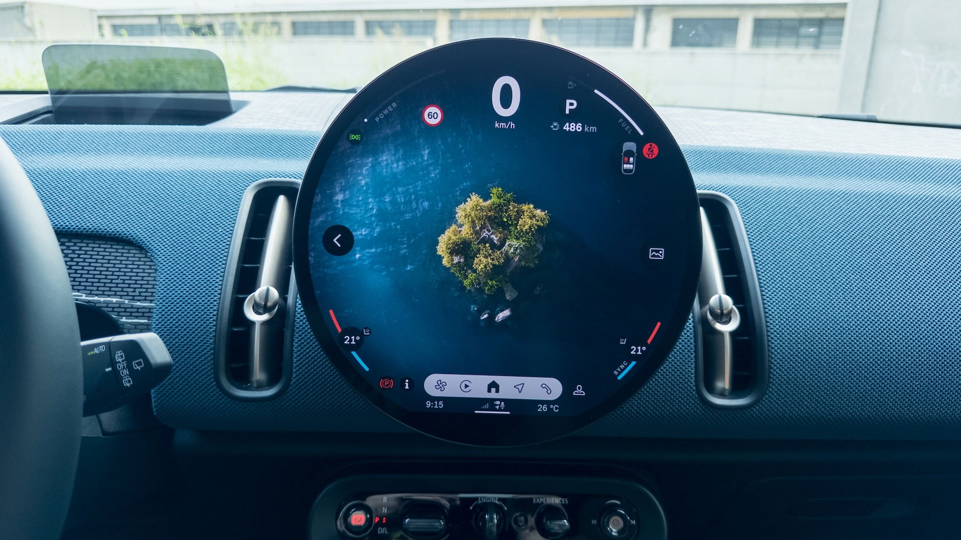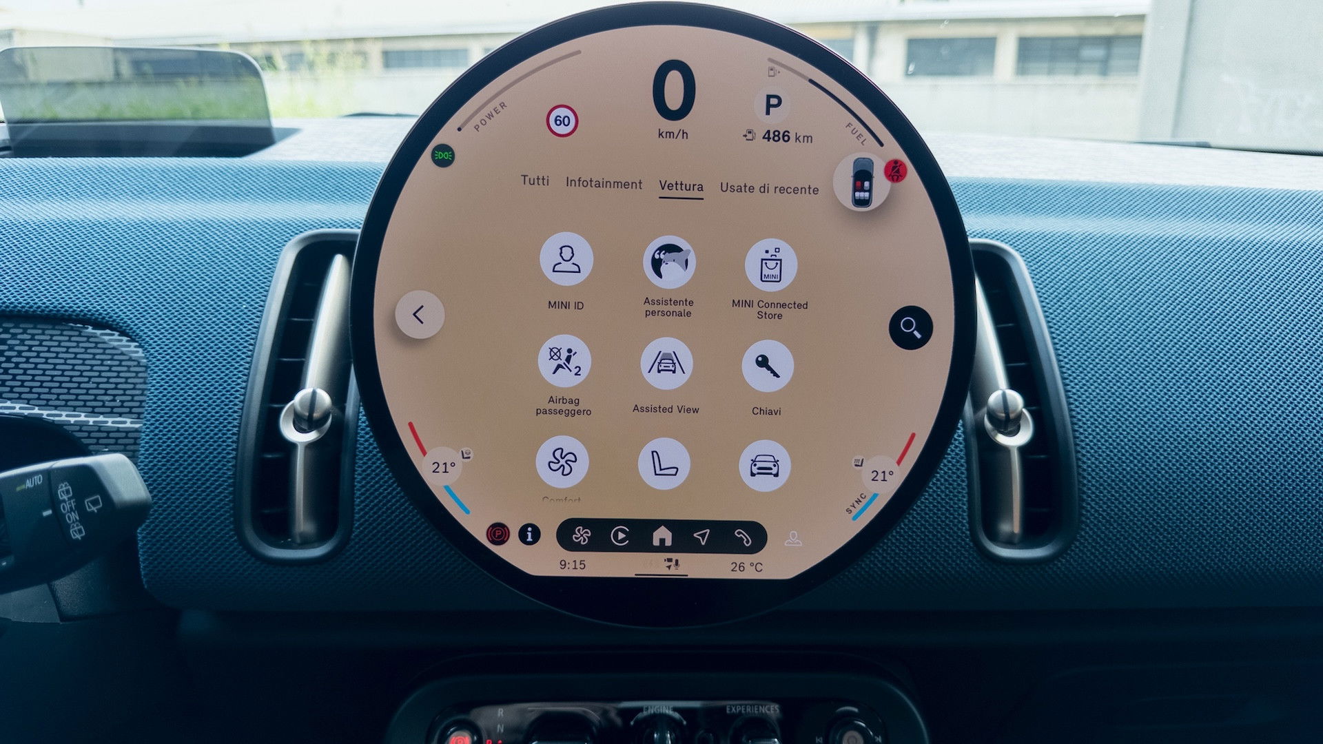Lo schermo centrale, circolare, è immenso. È un modello OLED, non serve andare a leggere le specifiche tecniche per rendersene conto. Sottile, colori accesi, contrasto molto alto. La sfida per Mini è stato inserire le informazioni in uno schermo tondo, un formato ben lontano dall’essere il miglior consiglio per cerca elevata ergonomia e organizzazione degli elementi, ma ci è riuscita, anche se non in tutto. Ve ne parlerò fra poco. Prima vorrei sottolineare la cura degli interni.