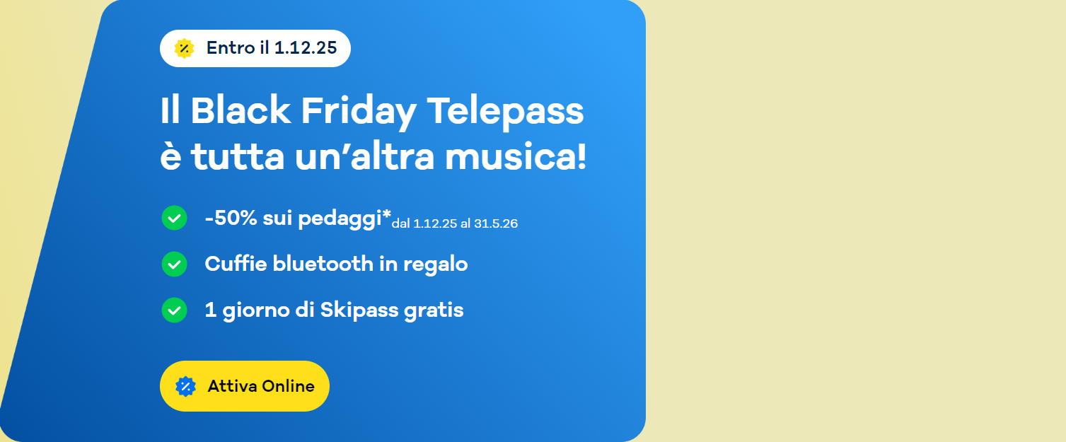 Ma le sorprese non finiscono qui: con l’attivazione del servizio, riceverete un paio di cuffie in regalo. Questo pensiero aggiunge un tocco di tecnologia al vostro quotidiano, permettendovi di ascoltare musica o rispondere alle chiamate in piena libertà e sicurezza mentre siete in viaggio. Un regalo che rende l’offerta Telepass del Black Friday ancora più conveniente e allettante.