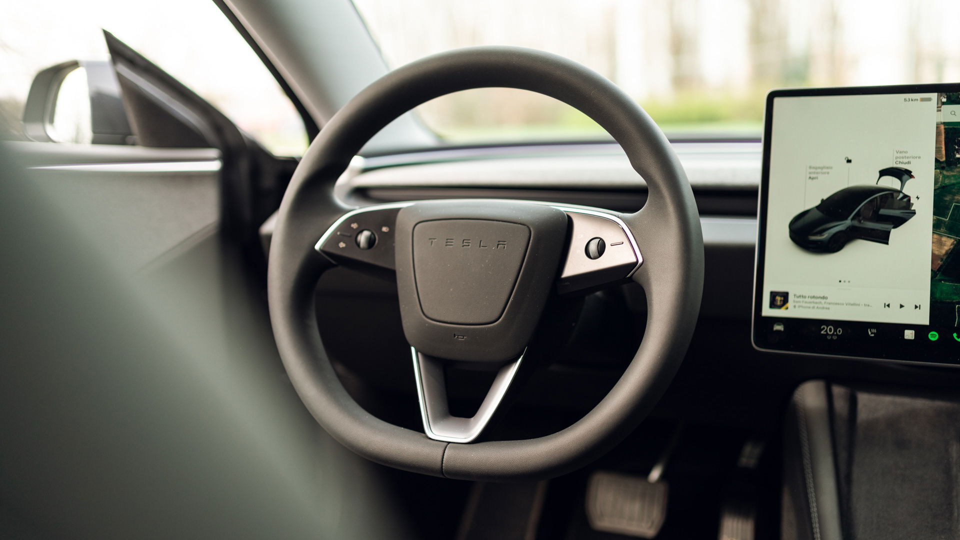 Il volante, con tutti i comandi integrati, e l'assenza di leve che gestiscono il cambio sullo schermo, seguono il precedente design introdotto su Model S / X. All'inizio può risultare disorientante, ma ci si abitua rapidamente e alla fine la differenza non si nota più. Il ripristino del clacson come pulsante centrale nel volante, in risposta alle numerose lamentele, è stata una scelta saggia.