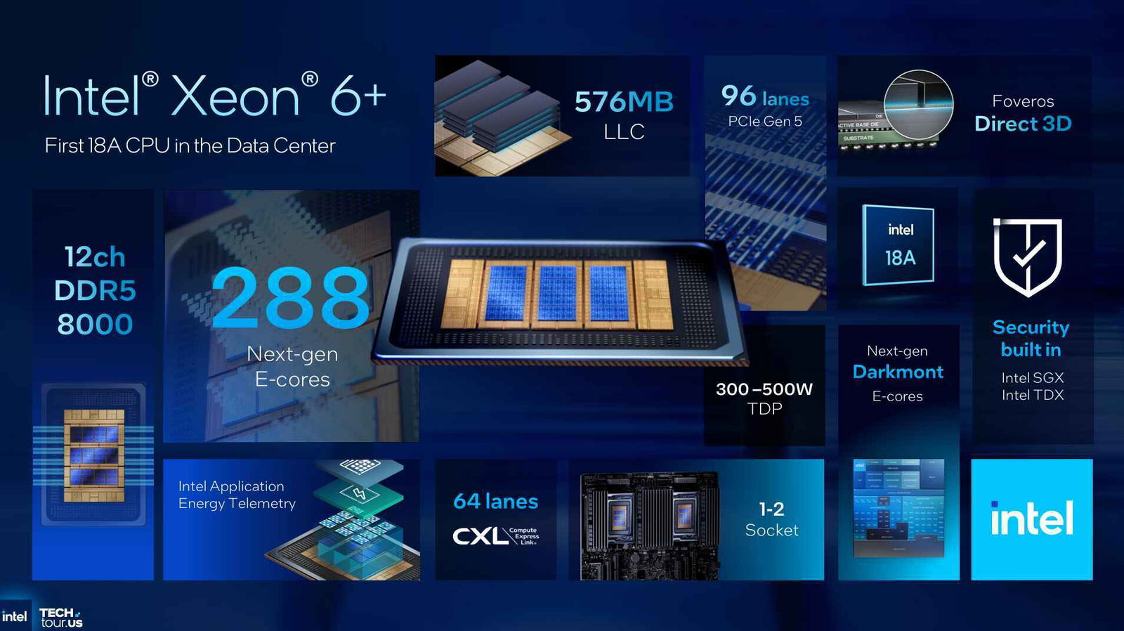 Non solo Panther Lake: l'Intel Tech Tour in Arizona ha svelato novità importanti anche per il mondo server e data center, con il debutto di Clearwater Forest. La nuova gamma è il punto d’arrivo della traiettoria iniziata da Intel con la disaggregazione di Xeon 6, ma ne cambia la scala grazie a tre elementi chiave: il salto di processo a 18A, l’adozione della costruzione 3D con Foveros Direct per la parte di calcolo e una nuova generazione di E-core, basata su architettura Darkmont e progettata specificamente per densità, prevedibilità ed efficienza su carichi scale-out.