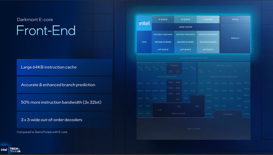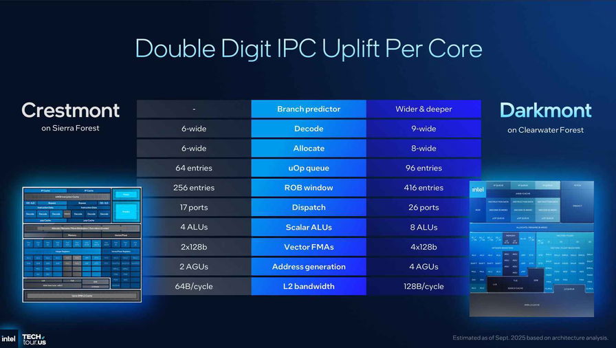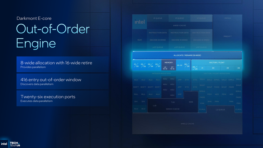 Il nuovo E-core è un altro tassello determinante. Darkmont amplia il front-end con tre decoder out-of-order a 3-way e una branch prediction più profonda e accurata, portando il throughput d’istruzioni a +50% rispetto alla generazione precedente. La finestra out-of-order sale a 416 entry, l’allocazione diventa 8-wide con retire 16-wide e le porte di esecuzione arrivano a ventisei, con otto ALU integer e una sezione vettoriale capace di sostenere il doppio del lavoro su 128 bit. Il sottosistema di memoria abbina prefetcher più aggressivi a buffering profondo, con fino a 128 miss L2 in volo, mentre a livello di affidabilità compaiono ECC sulla L1D, meccanismi di data poisoning e machine check recuperabili, oltre alla possibilità di lockstep tra core. Nel confronto diretto con Crestmont, Intel indica un guadagno fino al 17% di IPC per core e un miglioramento di efficienza fino al 23% lungo la load-line, segnali della ricerca di prestazioni “stabili” quando il sistema è saturo.
