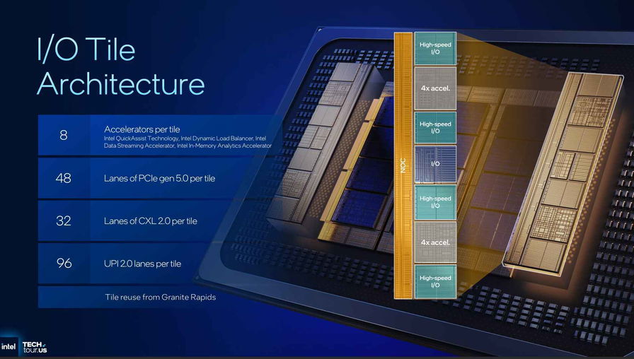 La scomposizione del SoC è funzionale al profilo dei carichi di destinazione. Ogni base tile integra quattro canali DDR5, fabric e una fetta di LLC da 192 MB; con tre base tile si arriva a dodici canali di memoria e a un totale di 576 MB di cache condivisa. Ogni compute tile contiene sei moduli, e ciascun modulo riunisce quattro E-core Darkmont e 4 MB di L2 condivisa: dodici tile portano il totale per socket a 288 core, con una gerarchia di memoria ampia e vicina al calcolo. Sui due tile I/O restano disponibili gli acceleratori di piattaforma (QuickAssist, Dynamic Load Balancer, Data Streaming Accelerator e In-Memory Analytics Accelerator) oltre alle linee PCIe 5.0 e ai link UPI. È un bilanciamento tra ampiezza di calcolo, banda memoria e capacità di offload che evita colli di bottiglia tipici dei carichi composti da microservizi, rete e analytics leggeri.