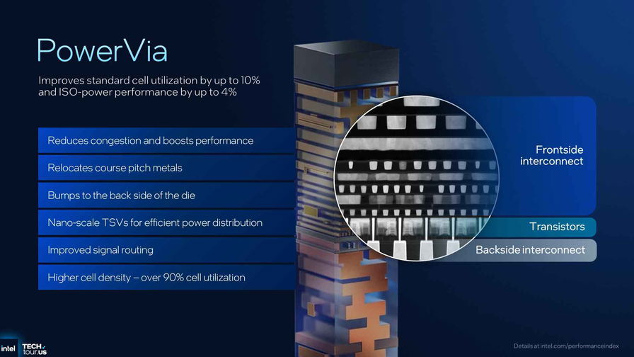 Il cuore dell’avanzamento è il nodo 18A. L’uso congiunto di RibbonFET e PowerVia agisce su due piani complementari: migliore controllo elettrostatico e Vmin più basso a livello di transistor, alimentazione dal retro con rete metallica dedicata che riduce le perdite e libera la parte front-side per il segnale. In pratica si ottiene una maggiore densità delle celle standard, minore congestione di routing e un incremento di efficienza a isopotenza, fattori particolarmente rilevanti quando si impilano molti core e si punta alla prevedibilità della latenza interna anche ad alta occupazione. È la base fisica che consente a Clearwater Forest di aumentare il numero di core senza sacrificare la qualità del comportamento sotto carico.