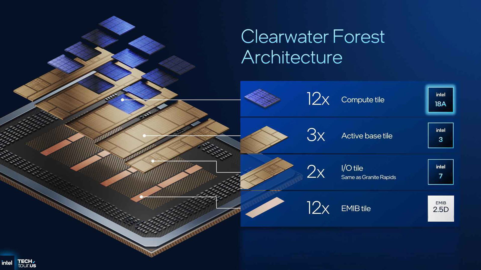 Da notare che i processori Intel Xeon 6+ Clearwater Forest sono prodotti esclusivamente con processi Intel: oltre alle compute tile per cui viene usato il più recente 18A, le base tile attive sono prodotte con nodo Intel 3 e le due I/O tile sono prodotte con Intel 7.