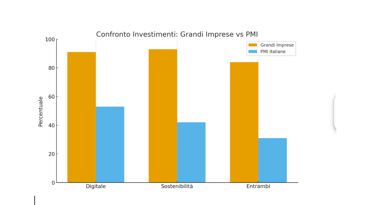 Come riportato dall’osservatorio Digital & Sustainable del Politecnico di Milano, la situazione attuale delle grandi imprese italiane registra dati rassicuranti: il 98% delle grandi imprese, infatti, ha un responsabile IT e l’83% ha una figura interna che si occupa di sostenibilità. In generale, le grandi imprese italiane tendono ad investire in modo significativo sia in ambito digitale sia in sostenibilità: in particolare il 91% delle grandi imprese italiane ha dimostrato di investire in maniera rilevante nel digitale, mentre il 93% nella sostenibilità (prevalentemente per obiettivi che riguardano aspetti ambientali piuttosto che ad argomentazioni legate alla compliance). Un altro dato portato alla luce dimostra come l’84% delle grandi imprese italiane investa sia in innovazione digitale sia in sostenibilità.