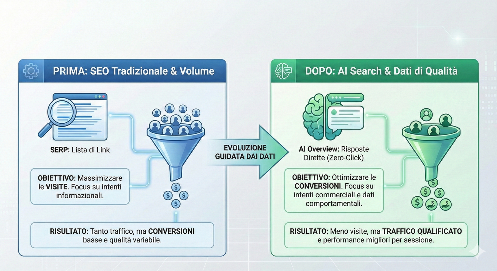 Un sito che dimezza le visite ma raddoppia la conversion rate è più profittevole di uno che continua a generare traffico di scarsa qualità e non in target. Per questo motivo l’integrazione strutturale tra SEO, CRO e Digital Analytics non è solo un vantaggio tecnico, ma una condizione di sostenibilità economica per il marketing del presente e del futuro.