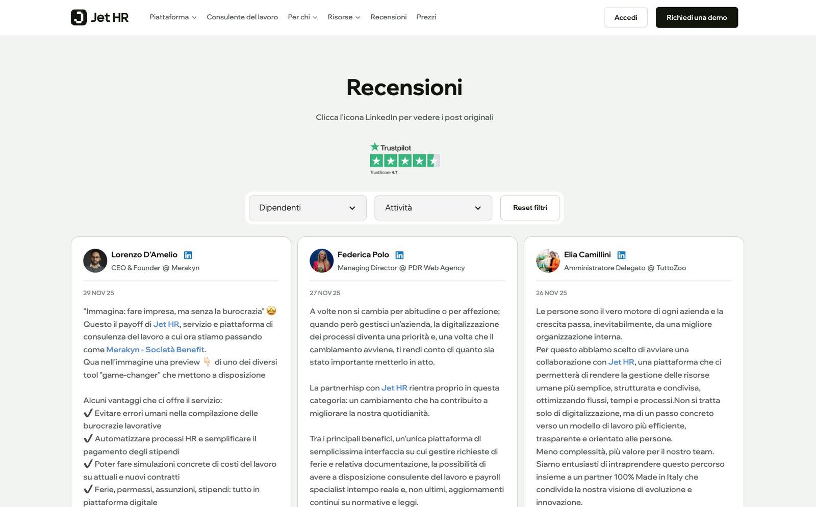 “L'esperienza con Jet HR è stata davvero positiva sin dal primo accesso. L'interfaccia utente è chiara, moderna e soprattutto intuitiva, il che rende la navigazione e l’utilizzo dei servizi davvero semplici anche per chi non è esperto. Uno dei punti di forza più evidenti è il servizio clienti: risposte rapide, cortesia e disponibilità nel risolvere qualsiasi dubbio.