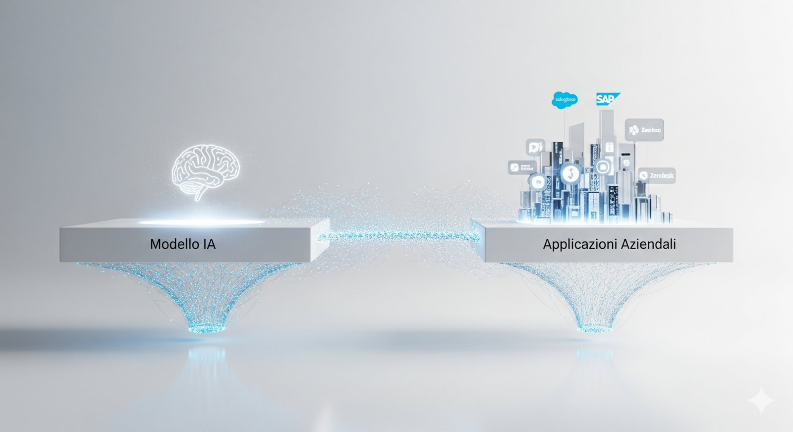 I modelli linguistici di grandi dimensioni (LLM), come quelli sviluppati da OpenAI, Google o Anthropic, hanno dimostrato una capacità straordinaria nel comprendere e generare linguaggio umano. Tuttavia, fino a oggi, hanno sofferto di un limite strutturale che ne ha frenato l'adozione su larga scala nei processi aziendali critici: sono come cervelli brillanti chiusi in una scatola di vetro. Possono analizzare e scrivere, ma non possono agire sul mondo esterno. Non possono prenotare un appuntamento sul calendario, interrogare un database aziendale o aggiornare la scheda di un cliente in un CRM. Sono sistemi isolati, privi di "mani" per operare sugli strumenti digitali che costituiscono l'ossatura di qualunque impresa.