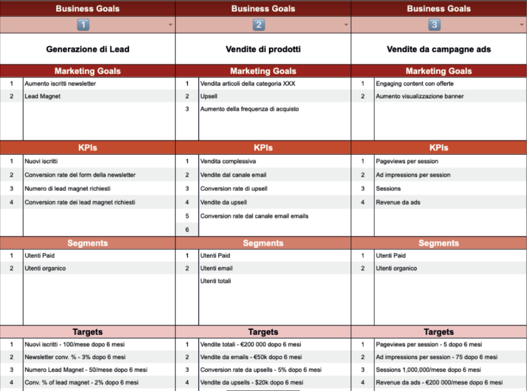 ■ a quale KPI aziendale sono riferite le metriche (ossia i valori numerici) di ogni tracciamento da implementare