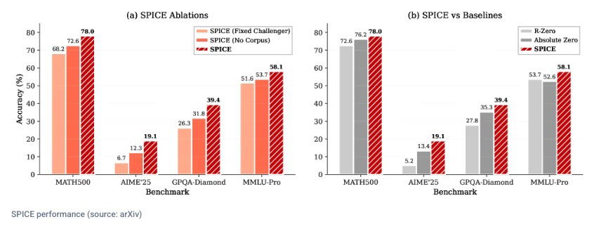 La soluzione proposta da SPICE si basa su un'architettura duale che elimina proprio questa simmetria informativa. Un singolo modello opera simultaneamente in due ruoli distinti: il "Challenger" costruisce un curriculum di problemi sempre più complessi attingendo da un vasto corpus documentale, mentre il "Reasoner" tenta di risolvere questi problemi senza avere accesso ai documenti originali. Questa separazione fondamentale impedisce la stagnazione che affligge altri metodi di auto-apprendimento.