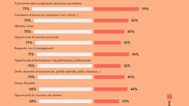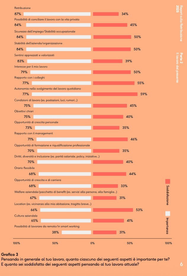 "L'imprenditore gioca a carte scoperte, vede tutte quelle che sono le informazioni del mercato della sua azienda, costi, ricavi. Il dipendente spesso non ha questi dati, quindi si trova in una posizione di svantaggio". La soddisfazione complessiva per la propria condizione lavorativa si attesta su una media di 6,43 su 10, un dato sostanzialmente stabile rispetto all'anno precedente che però maschera una realtà ben più complessa. Per l'87% dei lavoratori italiani la retribuzione rappresenta l'aspetto più rilevante del lavoro, superando persino la conciliazione vita-lavoro e la sicurezza occupazionale. Eppure, solo il 34% dei dipendenti si dichiara soddisfatto del proprio compenso, un paradosso che rivela la profondità del disagio economico percepito.