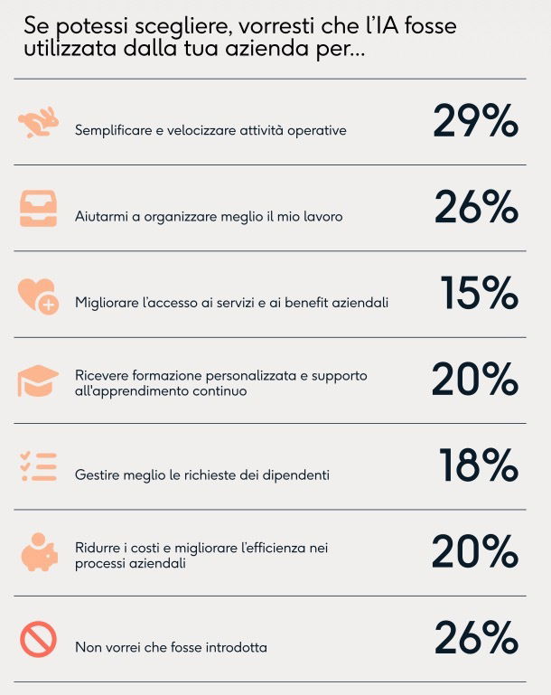 L'intelligenza artificiale inizia timidamente a fare capolino nelle aziende italiane, con solo il 15% delle imprese che l'ha adottata in modo strutturato. Contrariamente a quanto si potrebbe immaginare, il sentimento dominante tra i lavoratori non è la preoccupazione per una possibile sostituzione, ma piuttosto la curiosità e il desiderio di approfondire questa tecnologia, come dichiara il 25% degli intervistati. La maggioranza dei dipendenti percepisce l'IA come uno strumento essenzialmente operativo, capace di accelerare le attività ripetitive e migliorare l'organizzazione del lavoro.