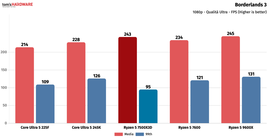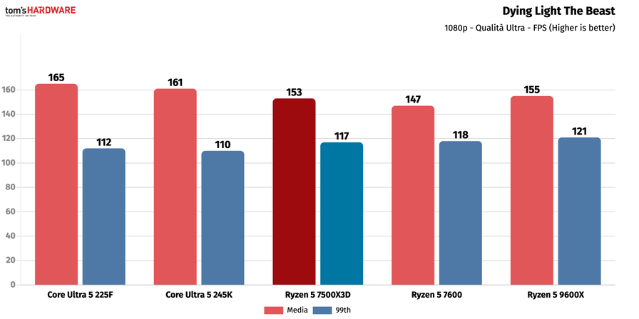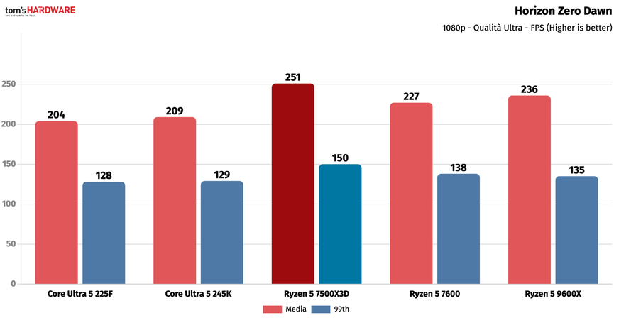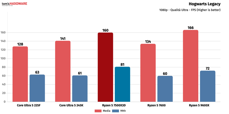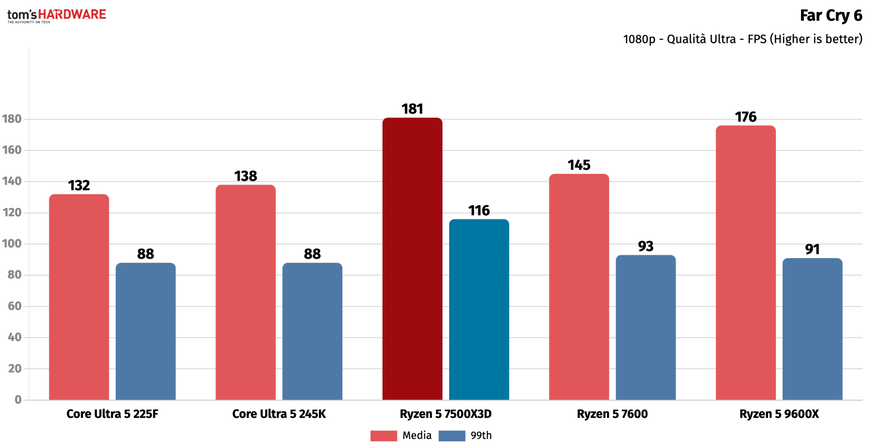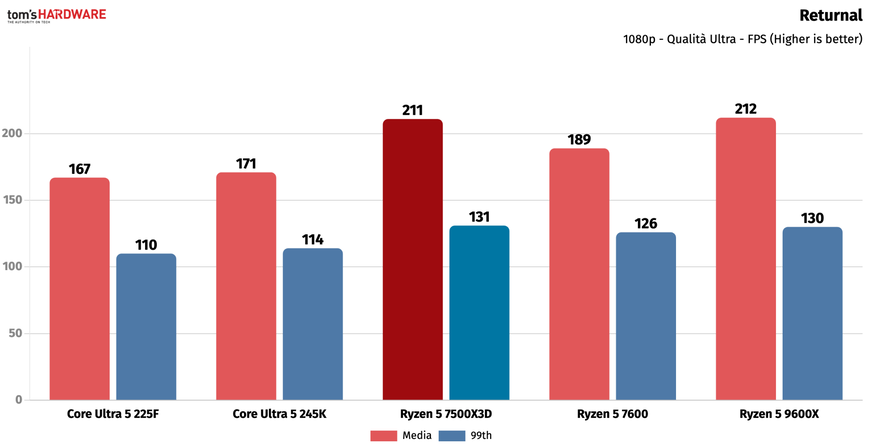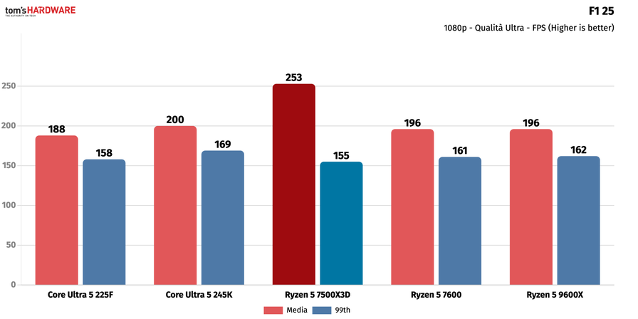 Più nel dettaglio, i giochi dove maggiormente si notato i benefici della cache 3D sono F1 25, Far Cry 6, Horizon Zero Dawn, Returnal e Hogwarts Legacy, con un vantaggio che arriva anche al 37% sul Core Ultra 5 225F e al 25% sul Ryzen 5 7600.