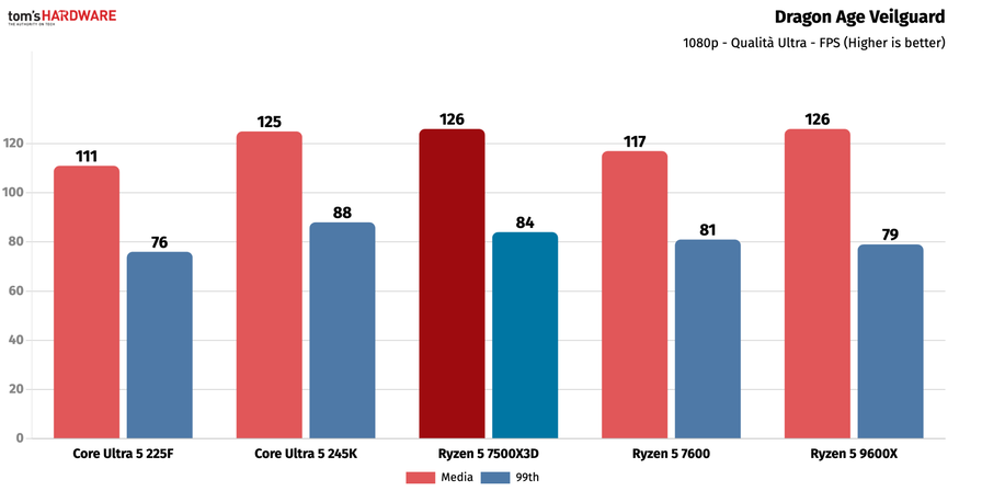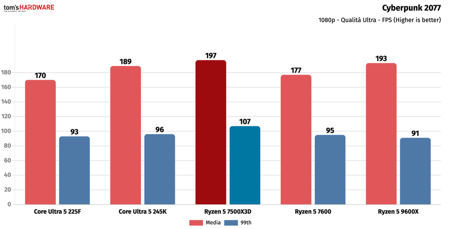 Iniziamo come sempre dai giochi, di cui trovate i grafici qui sotto. In media il Ryzen 5 7500X3D è il più veloce, facendo registrare un +7% sul Core Ultra 5 225F e un +4% sul Core Ultra 5 245K. Più ampio il divario con il Ryzen 5 7600 (circa il 10%), mentre è molto più contenuto quello con il Ryzen 5 9600X, intorno al 2-3%.