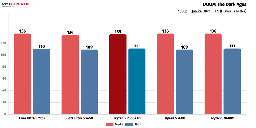 Ci sono però anche titoli dove la 3D V-Cache impatta meno e, in generale, i processori offrono performance molto simili tra loro: in Assassin’s Creed Shadows c’è un netto vantaggio per le CPU Intel, ma i due Core Ultra hanno praticamente le stesse performance, così come i tre Ryzen; In DOOM The Dark Ages i processori sono praticamente tutti identici, segno che la CPU gioca un ruolo solo margine, anche a bassa risoluzione.