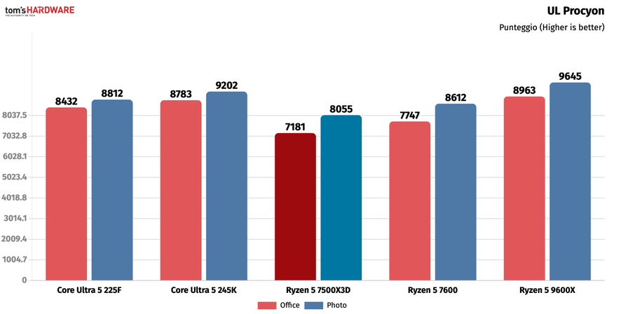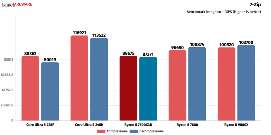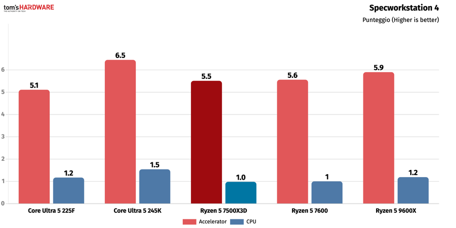 Come prevedibile, il Ryzen 5 7500X3D fatica parecchio in produttività, risultando il più lento tra i processori provati. Fa meglio del Core Ultra 5 225F solamente in 7-Zip, ma negli altri test è sempre il peggiore: si avvicina solamente al Ryzen 5 7600, da cui ha un distacco medio del 5%.