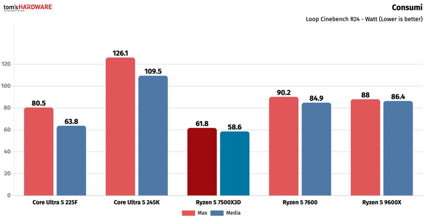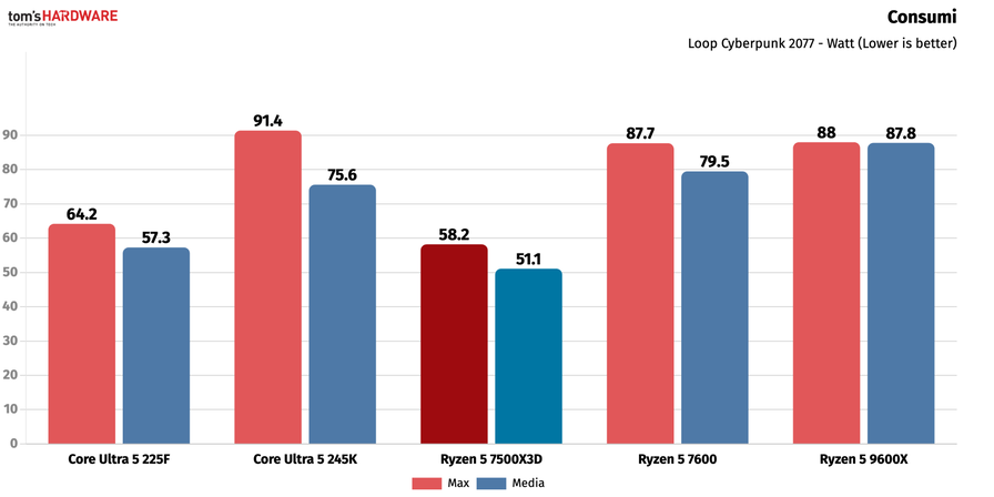Il Ryzen 5 7500X3D è decisamente poco energivoro: rimane all’interno del suo TDP nello stress test di Cinebench, con un assorbimento massimo di circa 62W e medio di 58,6W, mentre in Cyberpunk ha un picco di 58W e una media di 51W. In entrambi i casi, i valori registrati sono sensibilmente più bassi di quelli degli altri processori e lo rendono senza dubbio un campione di efficienza nel gaming.