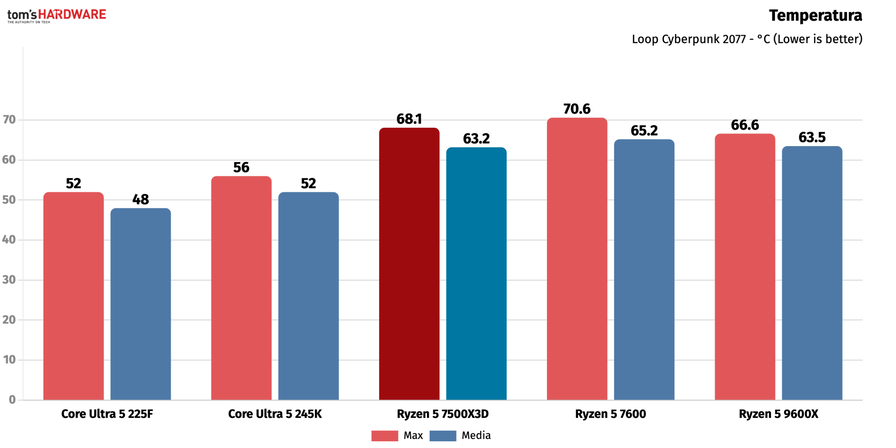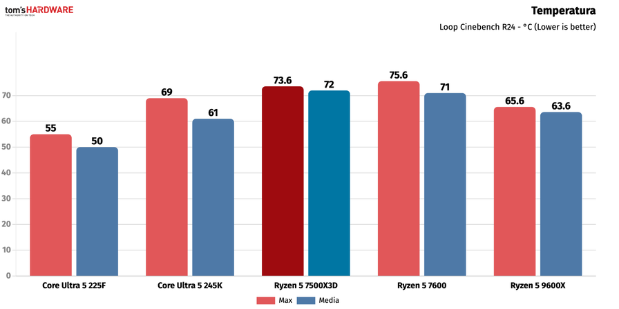 Buone anche le temperature d’esercizio, anche se non le migliori della categoria. Le due soluzioni Intel si dimostrano decisamente più fresche sia in gioco che nello stress test, lo stesso vale per il Ryzen 5 9600X; solamente il vecchio 7600 fa peggio di questo 7500X3D.