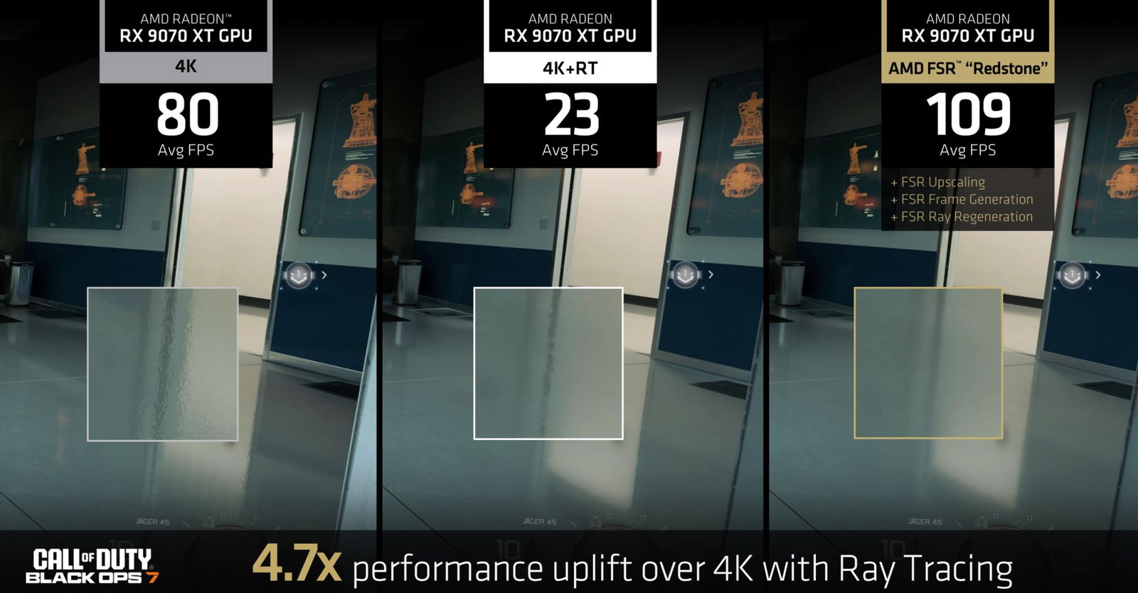 Il caso d'uso più eclatante presentato da AMD riguarda Call of Duty, dove FSR Redstone è in grado di garantire fino a 4,7 volte le prestazioni rispetto al rendering nativo, mantenendo al contempo una qualità visiva elevata anche con ray tracing attivo. Le demo mostrate evidenziano come sia possibile superare il framerate del 4K nativo, preservando dettagli, nitidezza e stabilità dell’immagine.