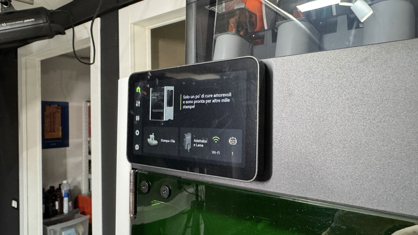 Differentemente dalla versione solo stampante, quella laser è dotata di un pannello anteriore verde, una protezione aggiuntiva per gli occhi. È piuttosto difficile vedere attraverso i pannelli verdi, ma la telecamera di monitoraggio invia un flusso video in full HD direttamente sul touch screen, sul tuo computer e sull'app mobile.