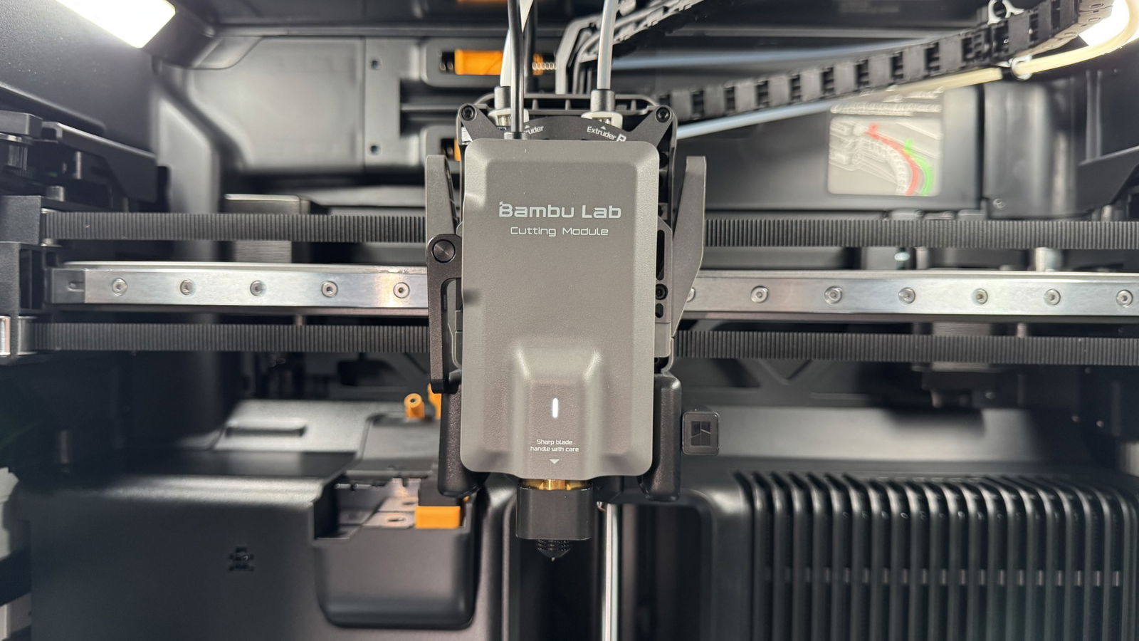 L'H2D ha tre telecamere, più una quarta per la combo laser. Le tre principali sono tutte da 1920 x 1080 pixel: una per il monitoraggio in tempo reale, una sull'ugello per il rilevamento AI, e una sulla testina. L'anteprima dal vivo appare in Bambu Studio nella pagina del dispositivo, sull’app Bambu Handy e sullo schermo stesso – utile sul Combo Laser dato che il vetro verde scuro rende difficile guardare facilmente all’interno. Può anche catturare timelapse.