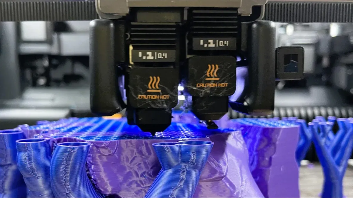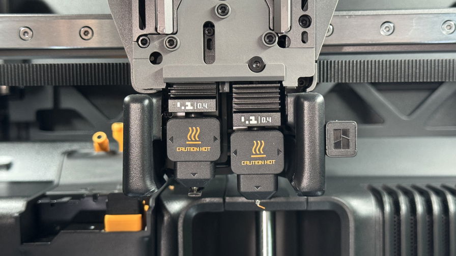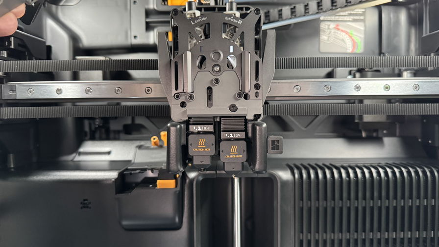 L'H2D ha due ugelli – destro e sinistro – su un hotend. I due ugelli lavorano insieme per stampare due colori senza sprechi, o stampare due materiali diversi contemporaneamente. Ad esempio, puoi stampare PLA con supporti PETG, o combinare TPU con il filamento di tua scelta.