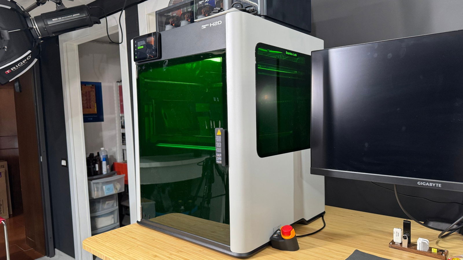 L'H2D è una stampante completamente chiusa con telaio in alluminio e acciaio, lati in plastica e finestre di vetro. Il touchpad da 5 pollici è una versione aggiornata di quello che si trova sulla X1C.