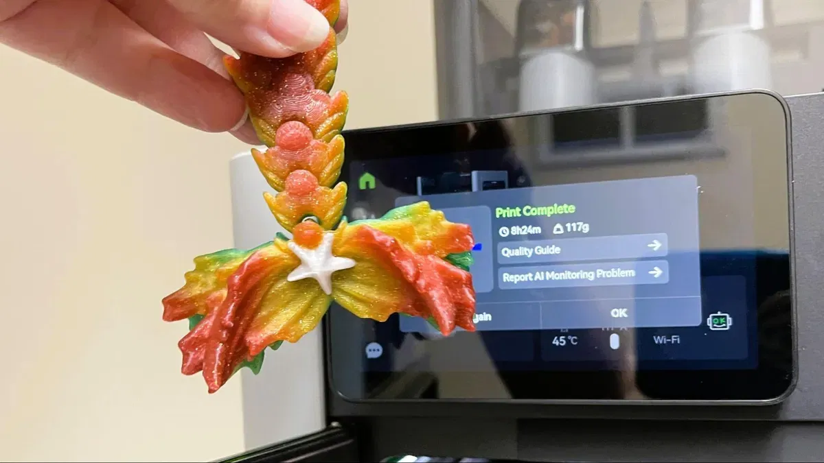 Durante i test con materiali alternativi come il CoPE, un co-poliestere proposto come sostituto del PLA, la H2D ha mantenuto un buon livello qualitativo anche in stampa multicolore avanzata. Un elaborato oggetto d’arredo stampato in cinque colori ha evidenziato una grande precisione nei dettagli e una qualità estetica di rilievo. L’intero progetto ha richiesto quasi 30 ore per la sola parte visiva principale. Nonostante la lunghezza del lavoro e la complessità dei passaggi, il risultato ha confermato la capacità della stampante di gestire combinazioni cromatiche complesse, anche a scapito di un certo consumo extra: oltre 100 grammi sprecati nella torre e nella pulizia. Tuttavia, la resa cromatica finale e la precisione degli strati giustificano la scelta.