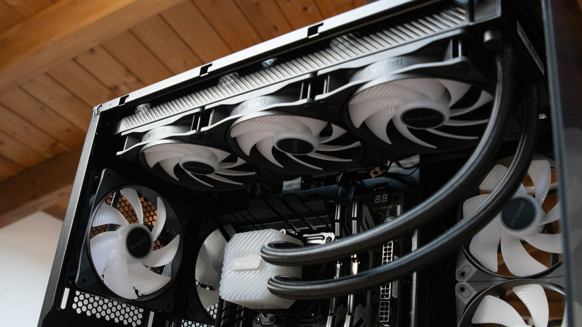 Viste le ampie possibilità di raffreddamento, per la ventilazione aggiuntiva ho scelto le be quiet! Light Wings LX 120mm, ventole ARGB che combinano prestazioni elevate e silenziosità. Le ho installate in basso come intake, collegandole comodamente a uno dei due HUB PWM / ARGB integrati nel retro del case.