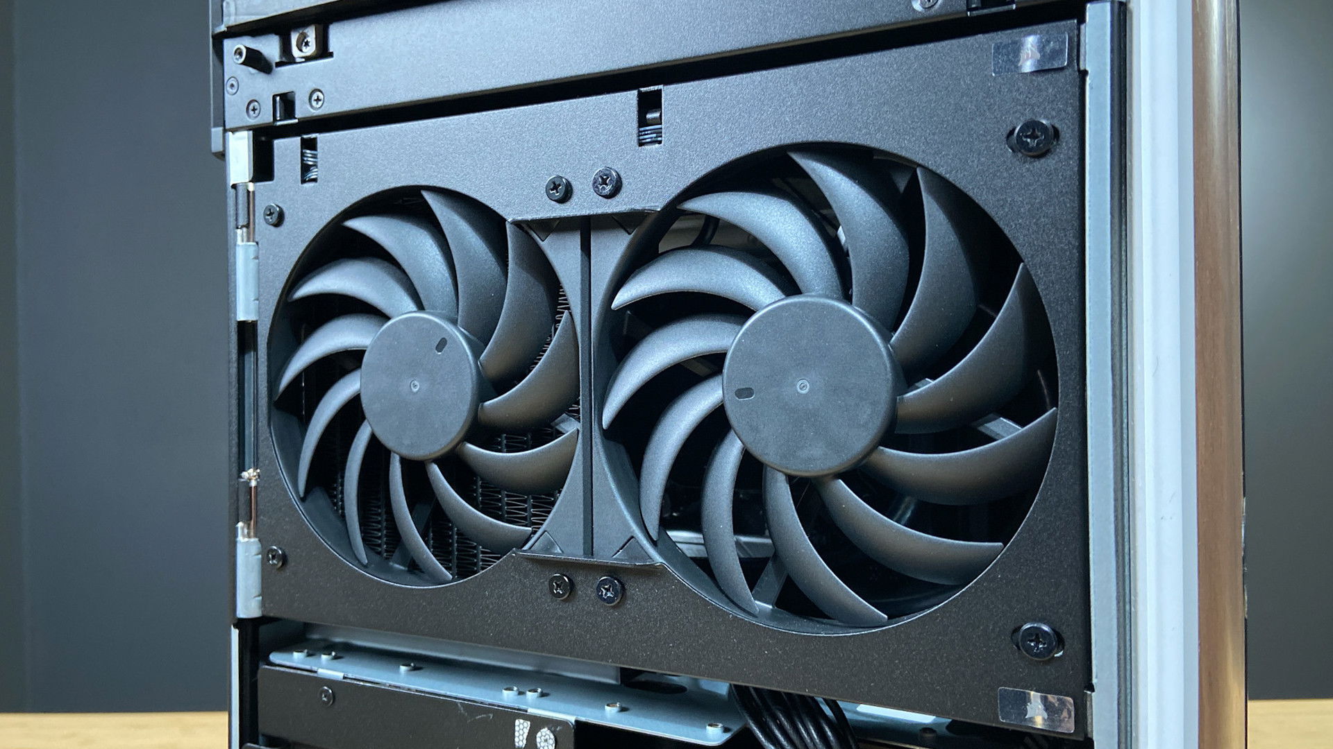 Una volta all’interno, ci si trova di fronte a tre ventole, due nella parte superiore e una in quella inferiore. La ventola in basso serve a convogliare aria fresca nella scheda video, per assicurare un raffreddamento efficacie; le due ventole in alto sono installate su un bracket che, una volta aperto, mostra la scheda madre e svela il raffreddamento della CPU.