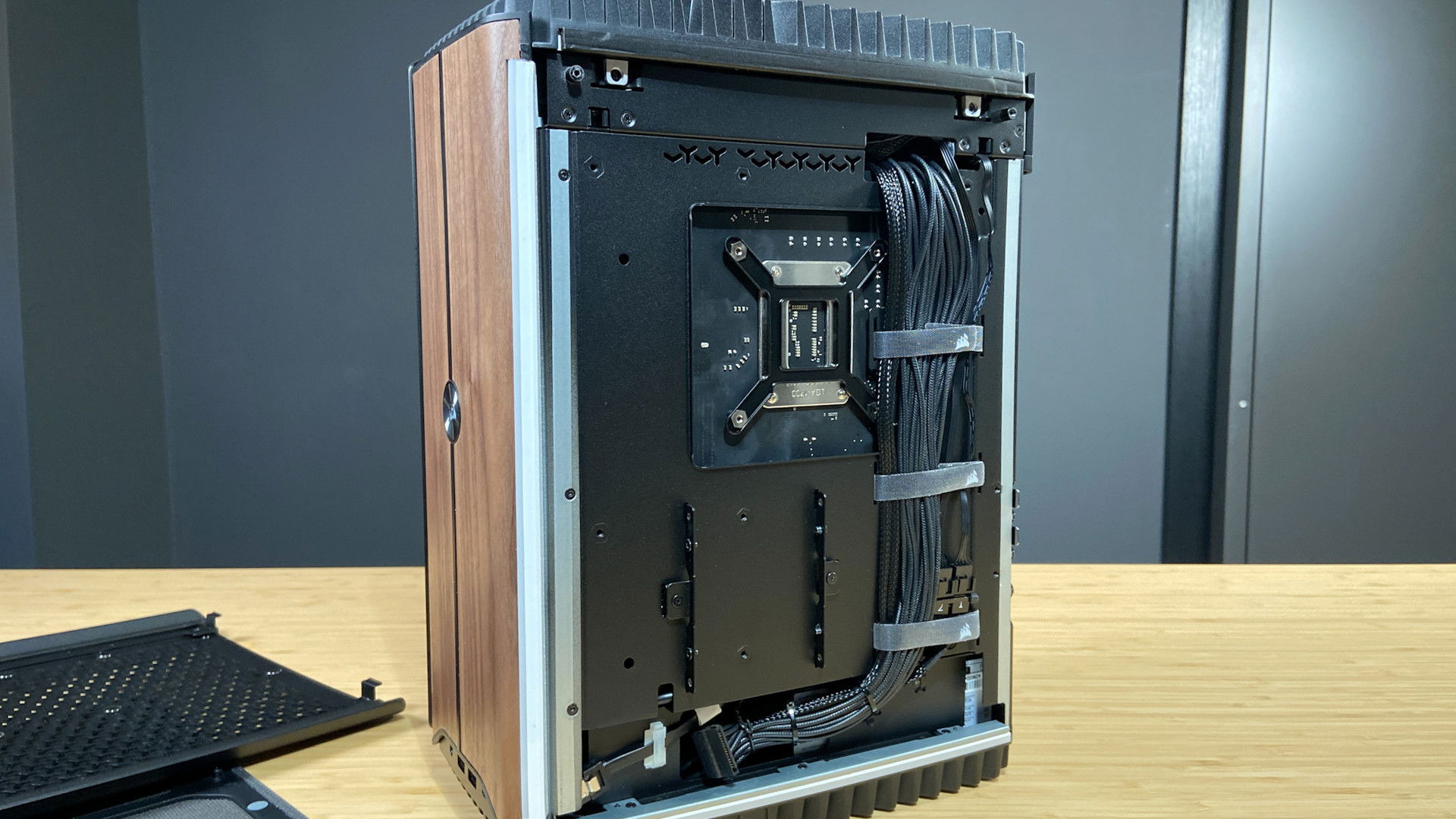 Rimuovendo l’altra paratia si ha accesso al retro della scheda madre, dove troviamo, oltre a un ottimo cable management (fondamentale visto il poco spazio nel case), la predisposizione per l’installazione di un SSD da 2,5”.