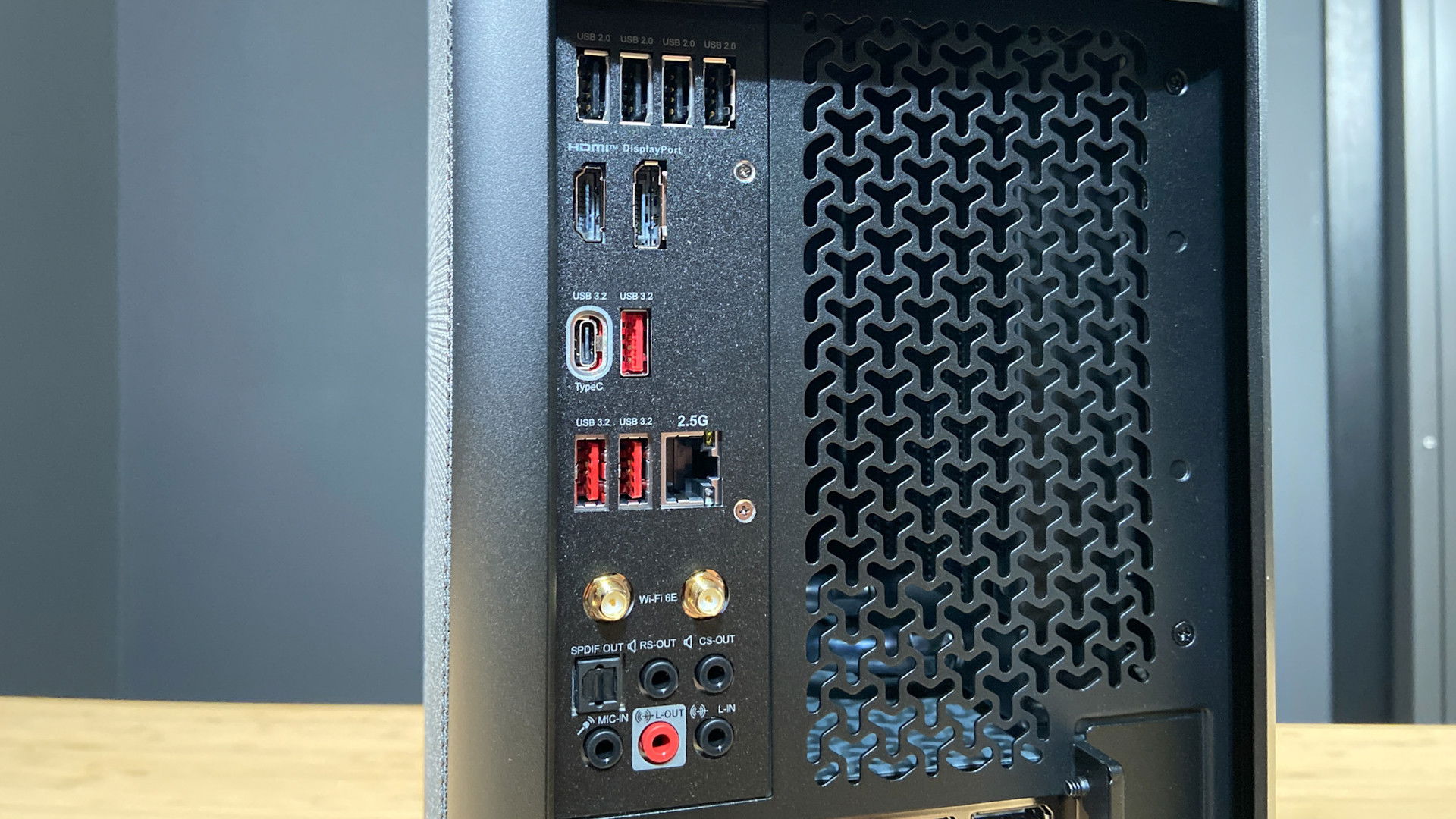 Sul davanti troviamo tre porte USB, due USB-A 3.2 da 5Gbps e una USB-C da 10Gbps, e un connettore jack 3.5mm per cuffie e microfono. Sul retro invece la scheda madre mette a disposizione quattro USB-A 2.0, tre USB-A da 10Gbps, una USB-C da 20Gbps, una HDMI, una DisplayPort e i classici jack audio. La scheda video, infine, offre tre DisplayPort 1.4 e una HDMI 2.1.