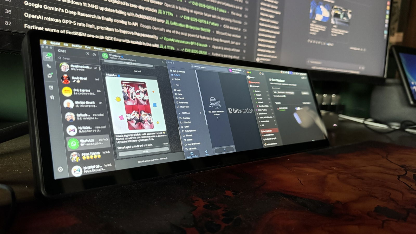 Nel nostro caso lo abbiamo abbinato a un Mac Mini in un contesto di pura produttività, con già collegato un monitor principale 32:9. L’EDGE è stato posizionato di fronte a quest’ultimo, al centro della scrivania. Dopo averlo configurato correttamente nel sistema operativo, vi abbiamo collocato alcune applicazioni d’uso continuo, come la chat di WhatsApp, il gestore attività e il gestore di password: strumenti con cui si interagisce spesso, a prescindere da ciò che si sta facendo sul monitor principale. Utilizzando anche più desktop in base al tipo di lavoro, avere un secondo schermo di questo tipo, sempre accessibile e indipendente dal desktop attivo, si è rivelato estremamente comodo, riducendo al minimo i passaggi tra desktop e aumentando la produttività.
